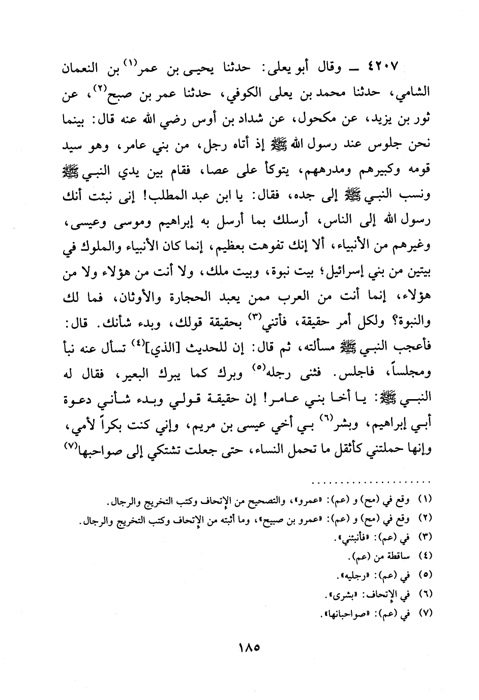 4207 - وَقَالَ أَبُو يَعْلَى: حدثنا يَحْيَى بْنُ عمر بْنُ النُّعْمَانِ الشامي، حدثنا مُحَمَّدُ بْنُ يَعْلَى الْكُوفِيُّ، حدثنا عُمَرُ بْنُ صُبْحٍ، عَنْ ثَوْرِ بْنِ يَزِيدَ، عَنْ مَكْحُولٍ، عَنْ شَدَّادِ بْنِ أَوْسٍ رَضِيَ الله عَنْه قَالَ: بَيْنَمَا نَحْنُ جُلُوسٌ عِنْدَ رَسُولِ اللَّهِ صَلَّى اللَّهُ عَلَيْهِ وَسَلَّمَ إِذْ أَتَاهُ رَجُلٌ، مِنْ بَنِي عَامِرٍ، وَهُوَ سَيِّدُ قومه وكبيرهم ومدرههم، يَتَوَكَّأُ عَلَى عَصًا، فَقَامَ بَيْنَ يدي النبي صَلَّى اللَّهُ عَلَيْهِ وَسَلَّمَ وَنَسَبَ النَّبِي صَلَّى اللَّهُ عَلَيْهِ وَسَلَّمَ إِلَى جَدِّهِ، فَقَالَ: يَا ابْنَ عَبْدِ الْمُطَّلَبِ! إِنِّي نُبِّئْتُ أَنَّكَ رَسُولُ اللَّهِ إِلَى النَّاسِ، أَرْسَلَكَ بِمَا أَرْسَلَ بِهِ إِبْرَاهِيمَ وَمُوسَى وَعِيسَى، وَغَيْرَهُمْ مِنَ الْأَنْبِيَاءِ، أَلَا إنك تَفَوَّهْتَ بِعَظِيمٍ، إِنَّمَا كَانَ الْأَنْبِيَاءُ وَالْمُلُوكُ فِي بَيْتَيْنِ مِنْ بَنِي إِسْرَائِيلَ؛ بَيْتِ نُبُوَّةٍ، وَبَيْتِ مُلْكٍ، وَلَا أَنْتَ مِنْ هَؤُلَاءِ وَلَا مِنْ هَؤُلَاءِ، إِنَّمَا أَنْتَ مِنَ الْعَرَبِ مِمَّنْ يَعْبُدُ الْحِجَارَةَ وَالْأَوْثَانَ، فَمَا لَكَ وَالنُّبُوَّةَ؟ وَلِكُلِّ أمر حقيقة، فأتني بِحَقِيقَةِ قَوْلِكِ، وَبَدْءِ شَأْنِكَ. قَالَ: فَأَعْجَبَ النبي صَلَّى اللَّهُ عَلَيْهِ وَسَلَّمَ مسألته، ثم قال: إِنَّ §لِلْحَدِيثِ [الَّذِي] تَسْأَلُ عَنْهُ نَبَأً وَمَجْلِسًا، فَاجْلِسْ. فَثَنَى رِجْلَهُ وَبَرَكَ كَمَا يَبْرُكُ الْبَعِيرُ، فَقَالَ لَهُ النَّبِيُّ صَلَّى اللَّهُ عَلَيْهِ وَسَلَّمَ: يَا أَخَا بَنِي عَامِرٍ! إِنَّ حَقِيقَةَ قُولِي وَبَدْءَ شَأْنِي دَعْوَةُ أبي إبراهيم، وبشر بي أَخِي عِيسَى بْنِ مَرْيَمَ، وإني كُنْتُ بِكْرًا لِأُمِّي، وَإِنَّهَا حَمَلَتْنِي كَأَثْقَلِ مَا تَحْمِلُ النِّسَاءُ، حَتَّى جَعَلَتْ تَشْتَكِي إِلَى صَوَاحِبِهَا
