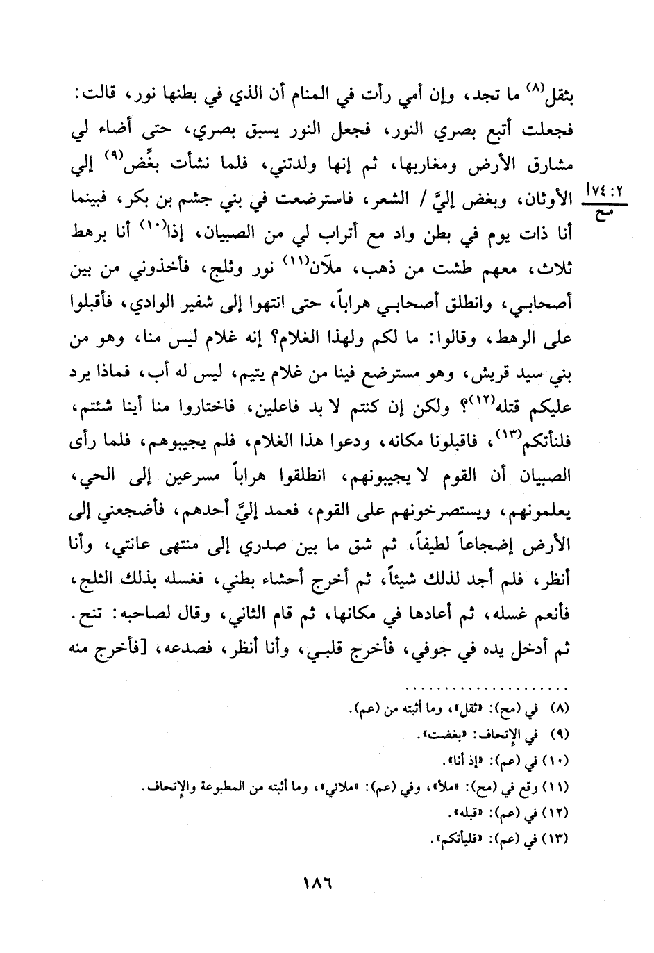 بِثِقَلِ (¬8) مَا تَجِدُ، وَإِنَّ أُمِّي رَأَتْ فِي الْمَنَامِ أَنَّ الَّذِيَ فِي بَطْنِهَا نُورٌ، قَالَتْ: فَجَعَلْتُ أُتْبِعُ بَصَرِي النُّورَ، فَجَعَلَ النُّورُ يَسْبِقُ بَصَرِي، حَتَّى أَضَاءَ لِي مَشَارِقَ الْأَرْضِ وَمَغَارِبَهَا، ثُمَّ إِنَّهَا وَلَدَتْنِي، فَلَمَّا نَشَأْتُ بغِّض (¬9) إِلَيَّ الْأَوْثَانُ، وَبُغِّضَ إلىَّ الشِّعْرُ، فَاسْتُرْضِعْتُ فِي بَنِي جُشَمِ بْنِ بَكْرٍ، فَبَيْنَمَا أَنَا ذَاتَ يَوْمٍ فِي بَطْنِ وَادٍ مَعَ أَتْرَابٍ لِي مِنَ الصِّبْيَانِ، إِذَا (¬10) أَنَا بِرَهْطٍ ثَلَاثٍ، مَعَهُمْ طَشْتٌ مِنْ ذَهَبٍ، مَلْآنُ (¬11) نُورٍ وَثَلْجٍ، فَأَخَذُونِي مِنْ بَيْنِ أَصْحَابِي، وَانْطَلَقَ أَصْحَابِي هِرَابًا، حَتَّى انْتَهَوْا إِلَى شَفِيرِ الْوَادِي، فَأَقْبَلُوا عَلَى الرَّهْطِ، وَقَالُوا: مَا لَكُمْ وَلِهَذَا الْغُلَامِ؟ أَنَّهُ غُلَامٌ لَيْسَ مِنَّا، وَهُوَ مِنْ بَنِي سَيِّدِ قُرَيْشٍ، وَهُوَ مُسْتَرْضَعٌ فِينَا مِنْ غُلَامٍ يَتِيمٍ، لَيْسَ لَهُ أَبٌ، فَمَاذَا يَرُدُّ عَلَيْكُمْ قَتْلُهُ (¬12)؟ وَلَكِنْ إِنْ كنتم لا بد فاعلين، فاختاروا منا أينا شئتم، فلنأتكم (¬13)، فَاقْبَلُونَا مَكَانَهُ، وَدَعُوا هَذَا الْغُلَامَ، فَلَمْ يُجِيبُوهُمْ، فَلَمَّا رَأَى الصِّبْيَانُ أَنَّ الْقَوْمَ لَا يُجِيبُونَهُمْ، انْطَلَقُوا هِرَابًا مُسْرِعِينَ إِلَى الْحَيِّ، يُعَلِّمُونَهُمْ، وَيَسْتَصْرِخُونَهُمْ عَلَى الْقَوْمِ، فَعَمَدَ إليَّ أَحَدِهِمْ، فَأَضْجَعَنِي إِلَى الْأَرْضِ إِضْجَاعًا لَطِيفًا، ثُمَّ شَقَّ مَا بَيْنَ صَدْرِي إِلَى مُنْتَهَى عَانَتِي، وَأَنَا أَنْظُرُ، فَلَمْ أَجِدْ لِذَلِكَ شَيْئًا، ثُمَّ أَخْرَجَ أَحْشَاءَ بَطْنِي، فَغَسَلَهُ بِذَلِكَ الثَّلْجِ، فَأَنْعَمَ غَسْلَهُ، ثُمَّ أَعَادَهَا في مكانها، ثم قام الثاني، وقال لِصَاحِبِهِ: تَنَحَّ.