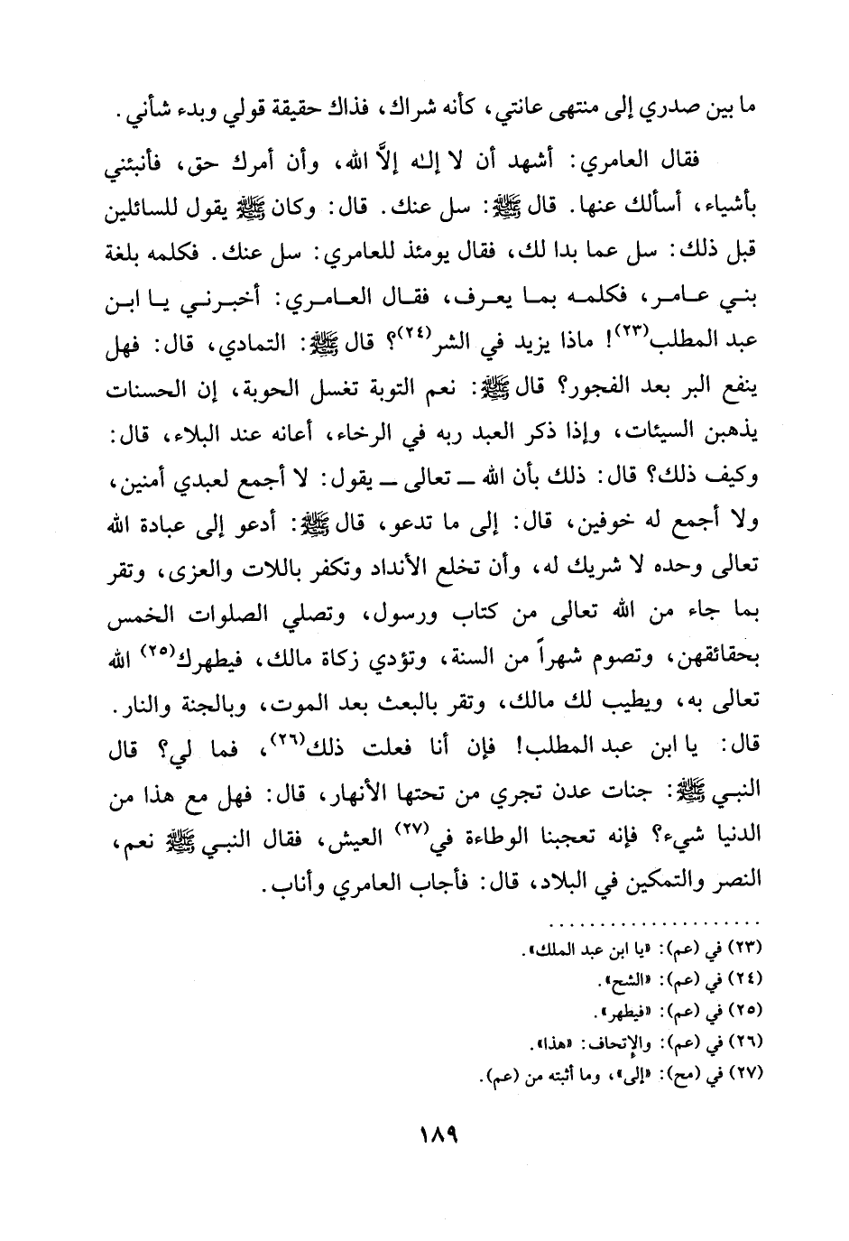 مَا بَيْنَ صَدْرِي إِلَى مُنْتَهَى عَانَتِي، كَأَنَّهُ شِرَاكٌ، فَذَاكَ حَقِيقَةُ قَوْلِي وَبَدْءُ شَأْنِي. فَقَالَ الْعَامِرِيُّ: أَشْهَدُ أَنْ لَا إِلَهَ إلَّا اللَّهُ، وَأَنَّ أَمْرَكَ حَقٌّ، فَأَنْبِئْنِي بِأَشْيَاءَ، أَسْأَلُكَ عَنْهَا. قال -صلى الله عليه وسلم-: سل عنك. قال: وكان إليك يقول لِلسَّائِلِينَ قَبْلَ ذَلِكَ: سَلْ عَمَّا بَدَا لَكَ، فَقَالَ يَوْمَئِذٍ لِلْعَامِرِيِّ: سَلْ عَنْكَ. فَكَلَّمَهُ بِلُغَةِ بَنِي عَامِرٍ، فَكَلَّمَهُ بِمَا يَعْرِفُ، فَقَالَ الْعَامِرِيُّ: أَخْبِرْنِي يَا ابْنَ عَبْدِ الْمُطَّلِبِ (¬23)! مَاذَا يَزِيدُ في الشر (¬24)؟ قال -صلى الله عليه وسلم-: التمادي، قال: فهل ينفع البر بعد الفجور؟ قال -صلى الله عليه وسلم-: نَعَمْ التَّوْبَةُ تَغْسِلُ الْحَوْبَةَ، إِنَّ الْحَسَنَاتِ يُذْهِبْنَ السَّيِّئَاتِ، وَإِذَا ذَكَرَ الْعَبْدُ رَبَّهُ فِي الرَّخَاءِ، أعانه عند النبلاء، قَالَ: وَكَيْفَ ذَلِكَ؟ قَالَ: ذَلِكَ بِأَنَّ اللَّهَ -تعالى- يَقُولُ: لَا أَجْمَعُ لِعَبْدِي أَمْنَيْنِ، وَلَا أَجْمَعُ له خوفين، قال: إلى ما تدعو، قال -صلى الله عليه وسلم-: أدعو إلى عبادة الله تعالى وَحْدَهُ لَا شَرِيكَ لَهُ، وَأَنْ تَخْلَعَ الْأَنْدَادَ وَتَكْفُرَ بِاللَّاتِ وَالْعُزَّى، وَتُقِرُّ بِمَا جَاءَ مِنَ الله تعالى مِنْ كِتَابٍ وَرَسُولٍ، وَتُصَلِّي الصَّلَوَاتِ الْخَمْسَ بِحَقَائِقِهِنَّ، وَتَصُومُ شَهْرًا مِنَ السَّنَةِ، وَتُؤَدِّي زَكَاةَ مَالِكَ، فيطهرك (¬25) الله تعالى بِهِ، وَيَطِيبُ لَكَ مَالَكَ، وَتَقِرُّ بِالْبَعْثِ بَعْدَ الْمَوْتِ، وَبِالْجَنَّةِ وَالنَّارِ.