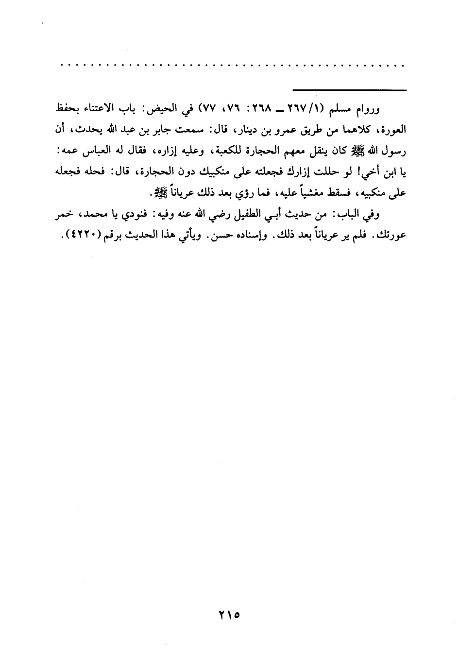 = ورواه مسلم (1/ 267 - 268: 76، 77) في الحيض: باب الاعتناء بحفظ العورة، كلاهما من طريق عمرو بن دينار، قال: سَمِعْتُ جَابِرَ بْنَ عَبْدِ اللَّهِ يُحَدِّثُ، أَنَّ رَسُولَ اللَّهِ -صَلَّى اللَّهُ عَلَيْهِ وسلم- كان ينقل معهم الحجارة للكعبة، وعليه إزاره، فقال له العباس عمه: يا ابن أخي! لو حللت إزارك فجعلته على منكبيك دون الحجارة، قال: فحله فجعله على منكبيه، فسقط مغشيًا عليه، فما رؤي بعد ذلك عريانا -صلى الله عليه وسلم-.