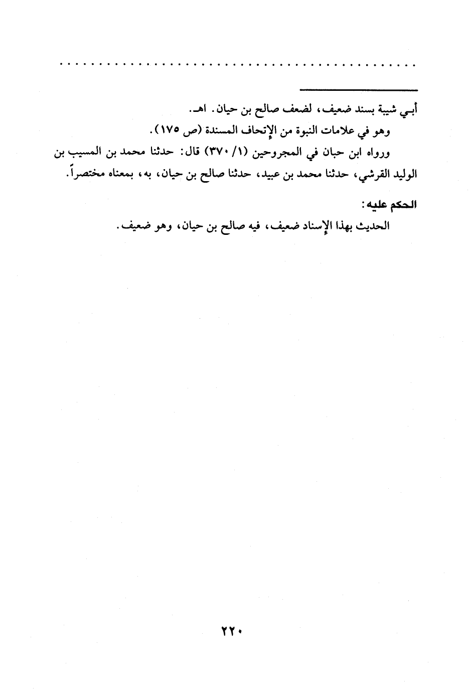ورواه ابن حبّان في المجروحين (1/ 370) قال: حدّثنا محمد بن المسيب بن الوليد القرشي، حدّثنا محمد بن عبيد، حدّثنا صالح بن حيان، به، بمعناه مختصرًا.