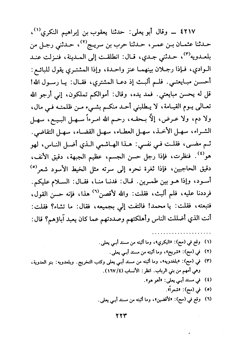 4217 - وَقَالَ أَبُو يَعْلَى: حدثنا يَعْقُوبُ بْنُ إِبْرَاهِيمَ النُّكْرِيُّ، حدثنا عُثْمَانُ بْنُ عُمَرَ، حدثنا حَرْبُ بْنُ سُرَيْجٍ، حَدَّثَنِي رَجُلٌ مِنْ بَلْعَدَوِيَّةَ، حَدَّثَنِي جَدِّي، قَالَ: انْطَلَقْتُ إِلَى الْمَدِينَةِ، فَنَزَلْتُ عِنْدَ الْوَادِي، فَإِذَا رَجُلَانِ بَيْنَهُمَا عَنْزٌ وَاحِدَةٌ، وإذا الْمُشْتَرِي يَقُولُ لِلْبَائِعِ: أَحْسِنْ مُبَايَعَتِي. فلم ألبث إذ دَعَا الْمُشْتَرِيَ، فَقَالَ: يَا رَسُولَ اللَّهِ! قُلْ لَهُ يُحْسِنُ مُبَايَعَتِي. فَمَدَّ يَدَهُ، وَقَالَ: §أَمْوَالُكُمْ تَمْلِكُونَ، إِنِّي أرجو الله تعالى يَوْمَ الْقِيَامَةِ، لَا يَطْلُبُنِي أَحَدٌ منكم بشيء من ظَلَمْتُهُ فِي مَالٍ، وَلَا دَمٍ، وَلَا عِرْضٍ، إِلَّا بِحَقِّهِ، رَحِمَ اللَّهُ امرءا سَهْلَ الْبَيْعِ، سَهْلَ الشِّرَاءِ، سَهْلَ الْأَخْذِ، سَهْلَ الْعَطَاءِ، سَهْلَ الْقَضَاءِ، سَهْلَ التَّقَاضِي. ثُمَّ مَضَى، فَقُلْتُ فِي نَفْسِي: هَذَا الْهَاشِمِيُّ الَّذِي أضل الناس، لهو هُوَ. فَنَظَرْتُ، فَإِذَا رَجُلٌ حَسَنُ الْجِسْمِ، عَظِيمُ الْجَبْهَةِ، دَقِيقُ الْأَنْفِ، دقيق الحاجبين، فإذا ثُغْرَةِ نَحْرِهِ إِلَى سُرَّتِهِ مِثْلُ الْخَيْطِ الْأَسْوَدِ شَعْرٌ أَسْوَدُ، وَإِذَا هُوَ بَيْنَ طِمْرَيْنِ. قَالَ: فَدَنَا مِنَّا، فَقَالَ: السَّلَامُ عَلَيْكُمْ. فَرَدَدْنَا عليه، فلم ألبث، فَقُلْتُ: وَاللَّهِ لَأُقَصَّنَّ هَذَا، فَإِنَّهُ حَسَنُ الْقَوْلِ، فَتَبِعْتُهُ، فَقُلْتُ: يَا مُحَمَّدُ! فَالْتَفَتَ إِلَيَّ بِجَمِيعِهِ، فَقَالَ: مَا تَشَاءُ؟ فَقُلْتُ: أَنْتَ الَّذِي أَضْلَلْتَ النَّاسَ وَأَهْلَكْتَهُمْ وَصَدَدْتَهُمْ عَمَّا كَانَ يَعْبُدُ آبَاؤُهُمْ؟ قَالَ: