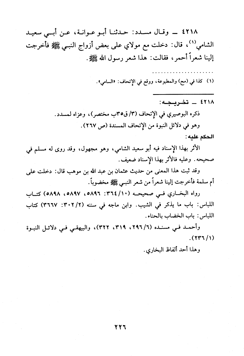 4218 - وَقَالَ مُسَدَّدٌ: حدثنا أَبُو عَوَانَةَ، عَنْ أَبِي سَعِيدٍ الشَّامِيِّ، قَالَ: دَخَلْتُ مَعَ مَوْلَايَ عَلَى بَعْضِ أَزْوَاجِ النَّبِيِّ صَلَّى اللَّهُ عَلَيْهِ وَسَلَّمَ §فَأَخْرَجَتْ إِلَيْنَا شَعْرًا أَحْمَرَ، فَقَالَتْ: هَذَا شَعْرُ رَسُولِ اللَّهِ صَلَّى اللَّهُ عَلَيْهِ وَسَلَّمَ.