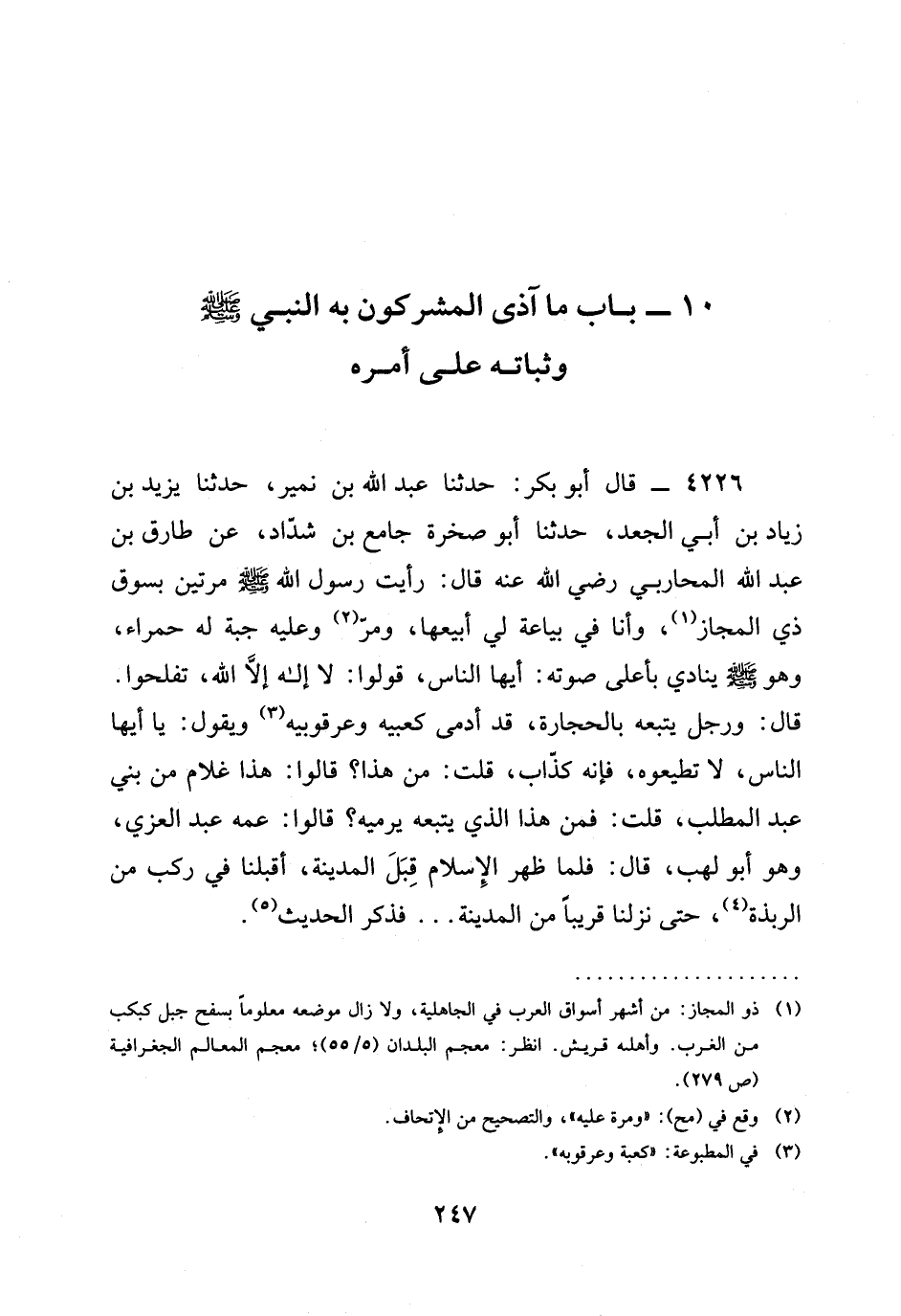 4226 - قَالَ أَبُو بَكْرٍ: حدثنا عَبْدُ اللَّهِ بْنُ نُمَيْرٍ، حدثنا يَزِيدُ بْنُ زِيَادِ بْنِ أَبِي الْجَعْدِ، حدثنا أَبُو صَخْرَةَ جَامِعُ بْنُ شَدَّادٍ، عَنْ طَارِقِ بْنِ عَبْدِ اللَّهِ الْمُحَارِبِيُّ رَضِيَ الله عَنْه قَالَ: رَأَيْتُ رَسُولَ اللَّهِ صَلَّى اللَّهُ عَلَيْهِ وَسَلَّمَ مَرَّتَيْنِ بِسُوقِ ذِي الْمَجَازِ، وَأَنَا فِي بِيَاعَةٍ لي أبيعها، ومر وَعَلَيْهِ جُبَّةٌ لَهُ حَمْرَاءُ، وَهُوَ صَلَّى اللَّهُ عَلَيْهِ وَسَلَّمَ يُنَادِي بِأَعْلَى صَوْتِهِ: أَيُّهَا النَّاسُ، §قُولُوا: لَا إِلَهَ إِلَّا اللَّهُ، تُفْلِحُوا. قَالَ: وَرَجُلٌ يَتَّبِعُهُ بِالْحِجَارَةِ، قَدْ أَدْمَى كَعْبَيْهِ وَعُرْقُوبَيْهِ وَيَقُولُ: يَا أَيُّهَا النَّاسُ، لَا تُطِيعُوهُ، فَإِنَّهُ كَذَّابٌ، قُلْتُ: مَنْ هَذَا؟ قَالُوا: هَذَا غُلَامٌ مِنْ بَنِي عَبْدِ الْمُطَّلِبِ، قُلْتُ: فَمَنْ هَذَا الَّذِي يَتْبَعُهُ يَرْمِيَهُ؟ قَالُوا: عَمُّهُ عَبْدُ الْعُزَّى، وَهُوَ أَبُو لَهَبٍ، قَالَ: فَلَمَّا ظَهَرَ الْإِسْلَامُ قِبَلَ الْمَدِينَةِ، أَقْبَلْنَا فِي رَكْبٍ مِنَ الرَّبَذَةِ، حَتَّى نَزَلْنَا قَرِيبًا مِنَ الْمَدِينَةِ ... فَذَكَرَ الْحَدِيثَ.