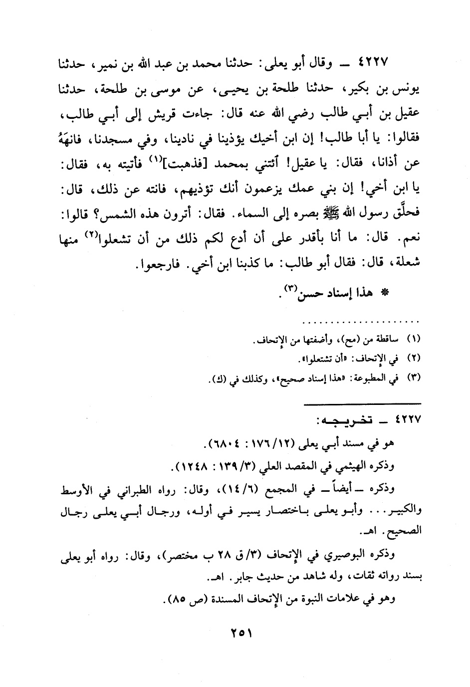 4227 - وَقَالَ أَبُو يَعْلَى: حدثنا مُحَمَّدُ بْنُ عَبْدِ اللَّهِ بْنِ نُمَيْرٍ، حدثنا يُونُسُ بْنُ بُكَيْرٍ، حدثنا طَلْحَةُ بْنُ يَحْيَى، عَنْ مُوسَى بْنِ طَلْحَةَ، حدثنا عَقِيلُ بْنُ أَبِي طَالِبٍ رَضِيَ الله عَنْه قَالَ: جَاءَتْ قُرَيْشٌ إِلَى أَبِي طَالِبٍ، فَقَالُوا: يَا أَبَا طَالِبٍ! إِنَّ ابْنَ أَخِيكَ يُؤْذِينَا فِي نَادِينَا، وَفِي مَسْجِدِنَا، فَانْهَهُ عَنْ أَذَانَا، فَقَالَ: يَا عَقِيلُ! ائْتِنِي بِمُحَمَّدٍ [فَذَهَبْتُ] فَأَتَيْتُهُ بِهِ، فَقَالَ: يَا ابْنَ أَخِي! إِنَّ بَنِي عَمِّكَ يَزْعُمُونَ أَنَّكَ تُؤْذِيهِمْ، فَانْتَهِ عَنْ ذَلِكَ، قَالَ: فَحَلَّقَ رَسُولُ اللَّهِ صَلَّى اللَّهُ عَلَيْهِ وَسَلَّمَ بَصَرَهُ إِلَى السَّمَاءِ. فَقَالَ: أَتَرَوْنَ هَذِهِ الشَّمْسَ؟ قَالُوا: نَعَمْ. قَالَ: §مَا أَنَا بِأَقْدَرَ عَلَى أَنْ أَدَعَ لَكُمْ ذَلِكَ مِنْ أَنْ تُشْعِلُوا مِنْهَا شُعْلَةً، قَالَ: فَقَالَ أَبُو طَالِبٍ: مَا كَذَبَنَا ابْنُ أَخِي. فَارْجِعُوا.