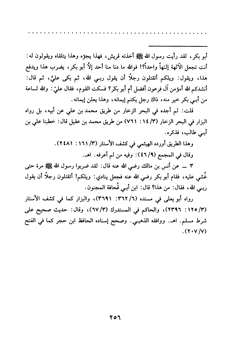 3 - عَنْ أَنَسِ بْنِ مَالِكٍ رَضِيَ اللَّهُ عَنْهُ قَالَ: لَقَدْ ضَرَبُوا رَسُولَ اللَّهِ -صَلَّى اللَّهُ عليه وسلم- مرة حتى غُشي عليه، فقام أبو بكر رضي الله عنه فَجَعَلَ يُنَادِي: وَيْلَكُمْ! أَتَقْتُلُونَ رَجُلًا أَنْ يَقُولَ ربي الله، فقال: من هذا؟ قال: ابن أبي قُحافة المجنون.