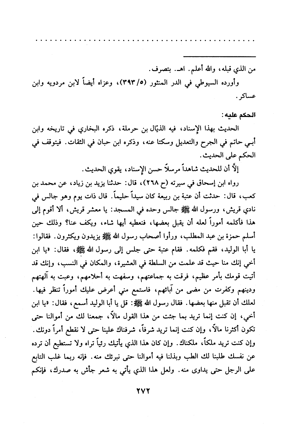 رواه ابن إسحاق في سيرته (ح 268)، قال: حدّثنا يَزِيدُ بْنُ زِيَادٍ، عَنْ مُحَمَّدِ بْنِ كَعْبٍ، قال: حدثت أن عتبة بن ربيعة كان سيدًا حليمًا. قال ذات يوم وهو جالس في نادي قريش، وَرَسُولُ اللَّهِ -صَلَّى اللَّهُ عَلَيْهِ وَسَلَّمَ- جَالِسٌ وحده في المسجد: يا معشر قريش، ألا أقوم إلى هذا فأكلمه أمورًا لعله أن يقبل بعضها، فنعطيه أيها شاء، ويكف عنا؟ وذلك حين أسلم حمزة بن عبد المطلب، ورأوا أصحاب رسول الله -صلى الله عليه وسلم- يزيدون ويكثرون. فقالوا: يا أبا الوليد، فقم فكلمه. فقام عتبة حتى جَلَسَ إِلَى رَسُولِ اللَّهِ -صَلَّى اللَّهُ عَلَيْهِ وسلم-، فقال: "يا ابن أخي إنك منا حيث قد علمت من السلطة في العشيرة، والمكان في النسب، وإنك قد أتيت قومك بأمر عظيم، فرقت به جماعتهم، وسفهت به أحلامهم، وعبت به آلهتهم ودينهم وكفرت من مضى من آبائهم، فاستمع مني أعرض عليك أمورًا تنظر فيها.