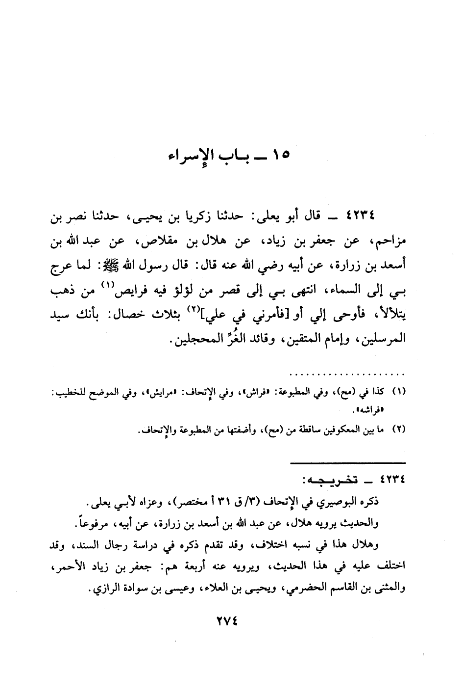 4234 - قَالَ أَبُو يَعْلَى: حدثنا زَكَرِيَّا بْنُ يَحْيَى، حدثنا نَصْرُ بْنُ مُزَاحِمٍ، عَنْ جَعْفَرِ بْنِ زِيَادٍ، عَنْ هِلَالِ بْنِ مِقْلَاصٍ، عَنْ عَبْدِ اللَّهِ بْنِ أَسْعَدَ بْنِ زُرَارَةَ، عَنْ أَبِيهِ رَضِيَ الله عَنْه قَالَ: قَالَ رَسُولُ اللَّهِ صَلَّى اللَّهُ عَلَيْهِ وَسَلَّمَ: §لَمَّا عُرِجَ بِي إِلَى السَّمَاءِ، انْتُهِيَ بِي إِلَى قَصْرٍ مِنْ لُؤْلُؤٍ فِيهِ فرايص مِنْ ذَهَبٍ يَتَلَأْلَأُ، فَأُوحِيَ إِلَيَّ أَوْ [فَأَمَرَنِي فِي عَلِيٍّ] بِثَلَاثِ خِصَالٍ: بِأَنَّكَ سَيِّدُ الْمُرْسَلِينِ، وَإِمَامُ الْمُتَّقِينَ، وَقَائِدُ الْغُرِّ الْمُحَجَّلِينَ.