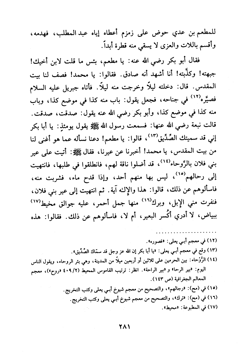 لِلْمُطْعِمِ بْنِ عَدِيٍّ حَوْضٌ عَلَى زَمْزَمَ أَعْطَاهُ إِيَّاهُ عَبْدُ الْمُطَّلِبِ، فَهَدَمَهُ، وَأَقْسَمَ بِاللَّاتِ وَالْعُزَّى لَا يَسْقِي مِنْهُ قَطْرَةً أَبَدًا. فَقَالَ أَبُو بَكْرٍ رَضِيَ اللَّهُ عَنْهُ: يَا مُطْعِمُ، بِئْسَ مَا قُلْتَ لِابْنِ أَخِيكَ! جَبَهْتَهُ! وكذَّبته! أَنَا أَشْهَدُ أَنَّهُ صَادِقٌ. فَقَالُوا: يَا مُحَمَّدُ! فَصِفْ لَنَا بَيْتَ الْمَقْدِسِ. قَالَ: دَخَلْتُهُ لَيْلًا وَخَرَجْتُ مِنْهُ لَيْلًا. فَأَتَاهُ جِبْرِيلُ عليه السلام فصيَّره (¬12) فِي جَنَاحِهِ، فَجَعَلَ يَقُولُ: بَابٌ مِنْهُ كَذَا فِي مَوْضِعِ كَذَا، وَبَابٌ مِنْهُ كَذَا في موضع كذا، وأبو بكر رضي الله عنه يقول: صدقت، صدقت. قالت نبعة رضي الله عنها: فَسَمِعْتُ رَسُولَ اللَّهِ -صَلَّى اللَّهُ عَلَيْهِ وَسَلَّمَ- يَقُولُ يومئذٍ: يَا أَبَا بَكْرٍ إِنِّي قَدْ سميتك الصّدِّيق (¬13)، قَالُوا: يَا مُطْعِمُ! دَعْنَا نَسْأَلُهُ عَمَّا هو أغنى لَنَا مِنْ بَيْتِ الْمَقْدِسِ، يَا مُحَمَّدُ! أَخْبِرْنَا عن عيرنا، فقال -صلى الله عليه وسلم-: أَتَيْتُ عَلَى عِيرِ بَنِي فُلَانٍ بالرَّوحاء (¬14)، قَدْ أَضَلُّوا نَاقَةً لَهُمْ، فَانْطَلَقُوا فِي طَلَبِهَا، فَانْتَهَيْتُ إِلَى رِحَالِهِمْ (¬15)، لَيْسَ بِهَا مِنْهُمْ أَحَدٌ، وَإِذَا قَدَحُ مَاءٍ، فَشَرِبْتُ مِنْهُ، فَاسْأَلُوهُمْ عَنْ ذَلِكَ، قالوا: هذا وَالْإِلَهِ آيَةٌ. ثُمَّ انْتَهَيْتُ إِلَى عِيرِ بَنِي فُلَانٍ، فَنَفَرَتْ مِنِّي الإِبل، وَبَرَكَ (¬16) مِنْهَا جَمَلٌ أَحْمَرُ، عَلَيْهِ جَوَالِقُ مَخِيطٌ (¬17) بِبَيَاضٍ، لَا أَدْرِي أكُسر الْبَعِيرُ، أَمْ لَا، فَاسْأَلُوهُمْ عَنْ ذَلِكَ. فقالوا: هذه