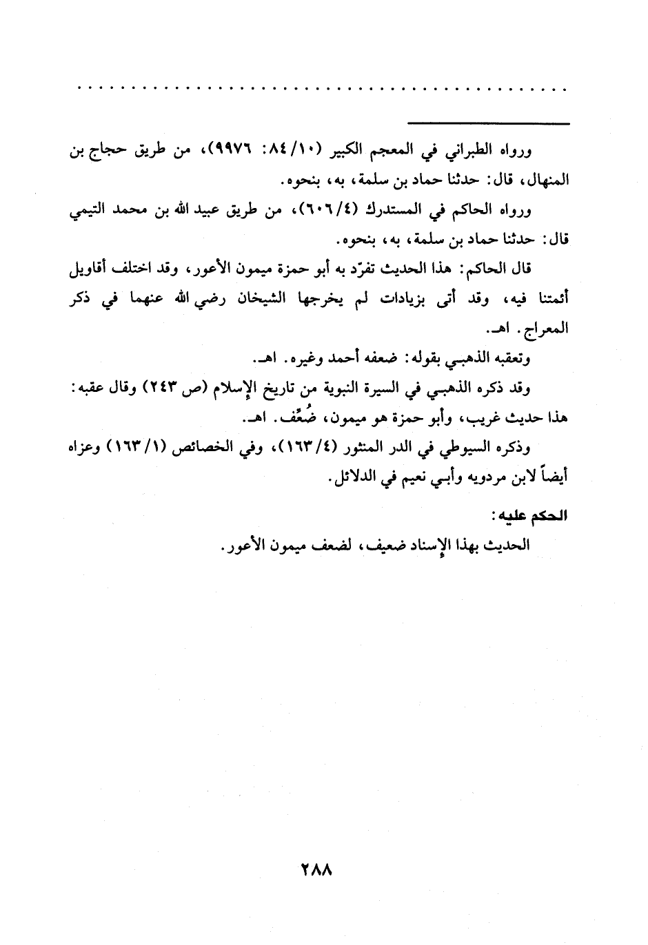 قال الحاكم: هذا الحديث تفرّد به أبو حمزة ميمون الأعور، وقد اختلف أقاويل أئمتنا فيه، وقد أتى بزيادات لم يخرجها الشيخان رضي الله عنهما في ذكر المعراج. أهـ.