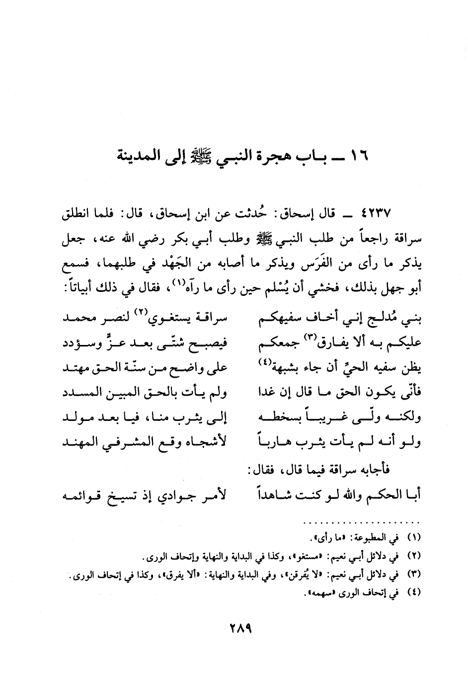 4237 - قَالَ إِسْحَاقُ: حُدِّثْتُ عَنِ ابْنِ إِسْحَاقَ، قَالَ: فَلَمَّا انْطَلَقَ سُرَاقَةُ رَاجِعًا مِنْ طَلَبِ النَّبِيِّ صَلَّى اللَّهُ عَلَيْهِ وَسَلَّمَ وَطَلَبِ أَبِي بَكْرٍ رَضِيَ الله عَنْه، جَعَلَ يَذْكُرُ مَا رَأَى مِنَ الْفَرَسِ وَيُذْكَرُ مَا أَصَابَهُ مِنَ الْجَهْدِ فِي طَلَبِهِمَا، فَسَمِعَ أَبُو جَهْلٍ بِذَلِكَ، فَخَشِيَ أَنْ يُسْلِمَ حين رأى ما رآه، فَقَالَ فِي ذَلِكَ أَبْيَاتًا: