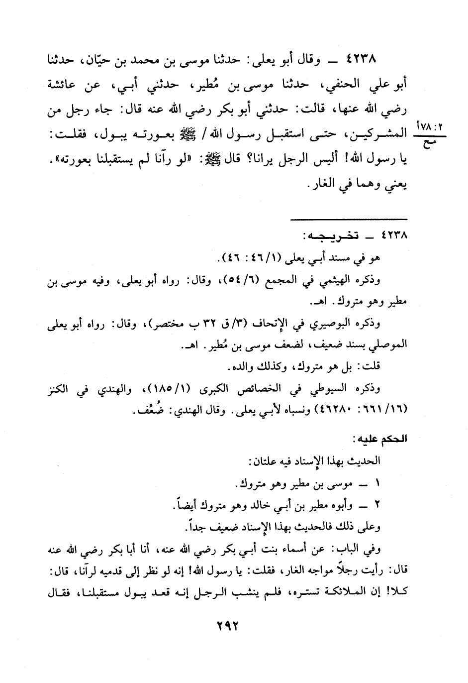 4238 - وَقَالَ أَبُو يَعْلَى: حدثنا مُوسَى بْنُ مُحَمَّدِ بْنِ حَيَّانَ، حدثنا أَبُو عَلِيٍّ الْحَنَفِيُّ، حدثنا مُوسَى بْنُ مَطِيرٍ، حَدَّثَنِي أَبِي، عن عائشة رَضِيَ الله عَنْها، قَالَتْ: حَدَّثَنِي أَبُو بَكْرٍ رَضِيَ الله عَنْه قَالَ: §جَاءَ رَجُلٌ مِنَ الْمُشْرِكِينَ، حَتَّى اسْتَقْبَلَ رَسُولَ اللَّهِ / صَلَّى اللَّهُ عَلَيْهِ وَسَلَّمَ بِعَوْرَتِهِ يَبُولُ، فَقُلْتُ: يَا رَسُولَ اللَّهِ! أَلَيْسَ الرَّجُلُ يَرَانَا؟ قَالَ صَلَّى اللَّهُ عَلَيْهِ وَسَلَّمَ: " لَوْ رَآنَا لَمْ يَسْتَقْبِلْنَا بِعَوْرَتِهِ ". يَعْنِي وَهُمَا فِي الْغَارِ.