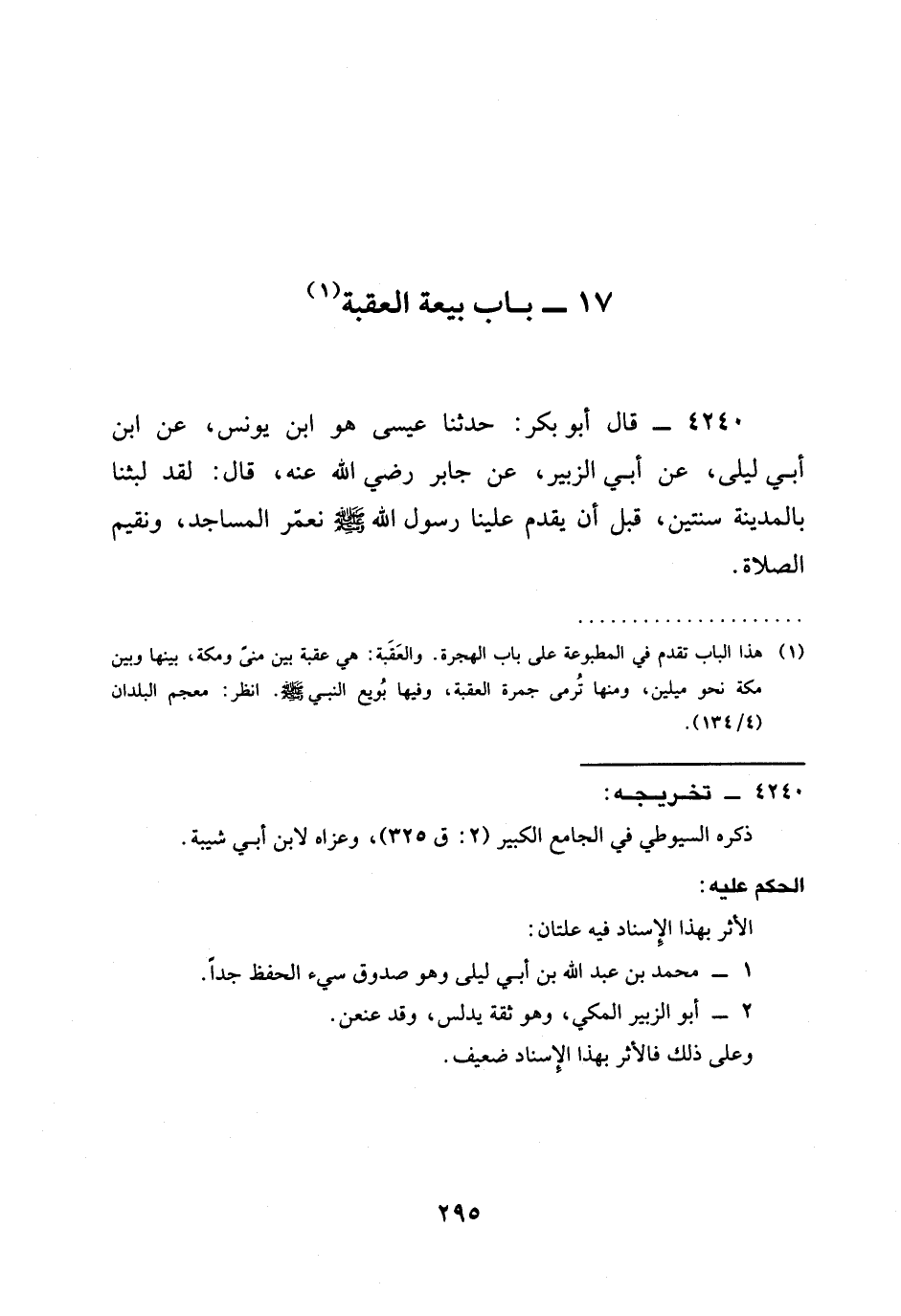 4240 - قَالَ أَبُو بَكْرٍ: حدثنا عِيسَى هُوَ ابْنُ يُونُسَ، عَنِ ابْنِ أَبِي لَيْلَى، عَنْ أَبِي الزُّبَيْرِ، عَنْ جَابِرٍ رَضِيَ الله عَنْه، قَالَ: لَقَدْ §لَبِثْنَا بِالْمَدِينَةِ سَنَتَيْنِ، قَبْلَ أَنْ يَقْدَمَ عَلَيْنَا رَسُولُ اللَّهِ صَلَّى اللَّهُ عَلَيْهِ وَسَلَّمَ نَعْمُرُ الْمَسَاجِدَ، وَنُقِيمُ الصَّلَاةَ.