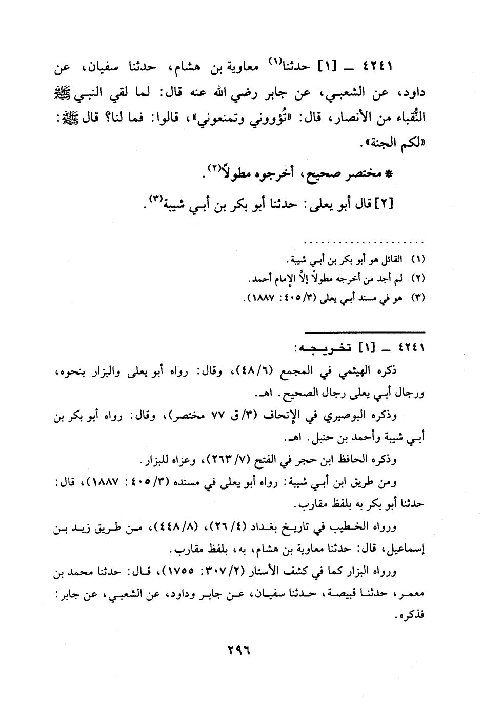 4241 -[1] حَدَّثَنَا مُعَاوِيَةُ بْنُ هِشَامٍ، حدثنا سُفْيَانُ، عَنْ دَاوُدَ، عَنِ الشَّعْبِيِّ، عَنْ جَابِرٍ رَضِيَ الله عَنْه قَالَ: لَمَّا لقي النبي صَلَّى اللَّهُ عَلَيْهِ وَسَلَّمَ النُّقَبَاءَ مِنَ الْأَنْصَارِ، قَالَ: " §تَؤْوُونِي وَتَمْنَعُونِي "، قَالُوا: فَمَا لَنَا؟ قَالَ صَلَّى اللَّهُ عَلَيْهِ وَسَلَّمَ: " لَكُمُ الْجَنَّةُ ".