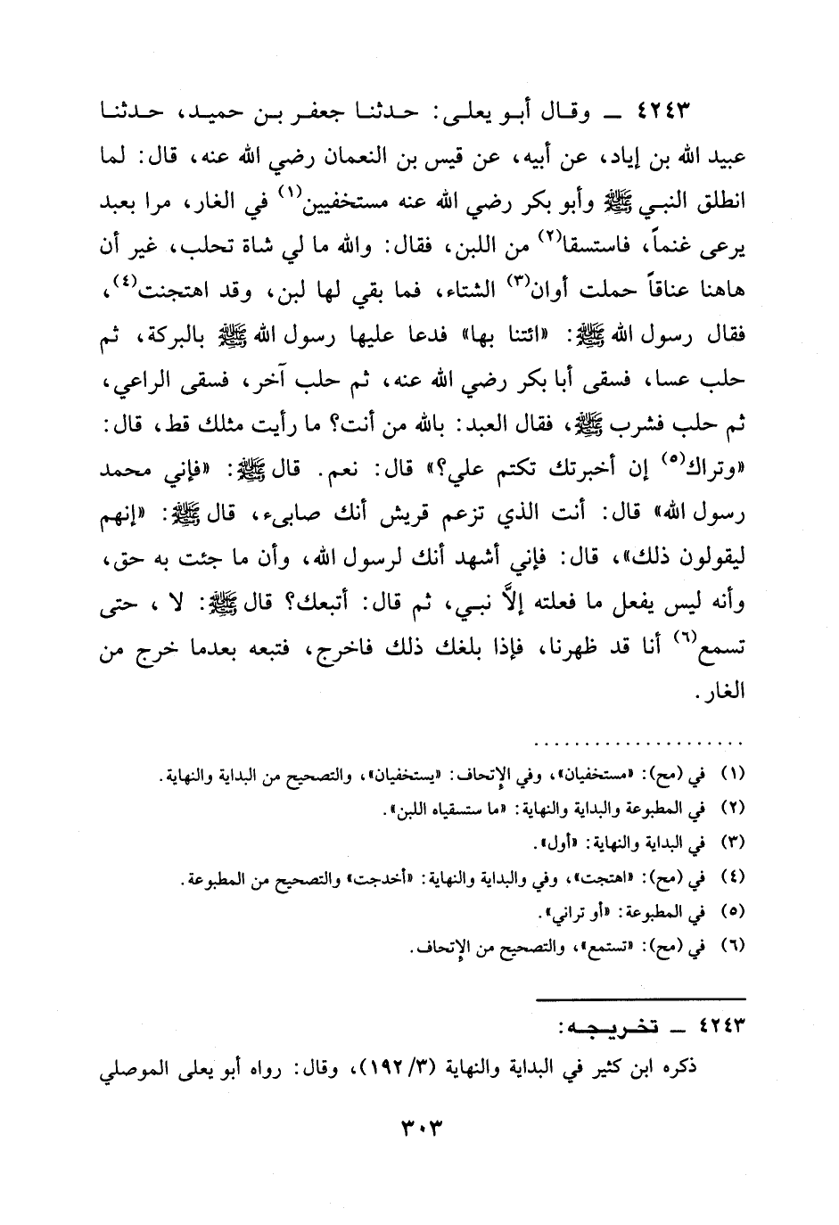 4243 - وَقَالَ أَبُو يَعْلَى: حدثنا جَعْفَرُ بْنُ حُمَيْدٍ، حدثنا عُبَيْدُ اللَّهِ بْنُ إِيَادٍ، عَنْ أَبِيهِ، عَنْ قَيْسِ بْنِ النُّعْمَانِ رَضِيَ الله عَنْه، قَالَ: لَمَّا انْطَلَقَ النَّبِيُّ صَلَّى اللَّهُ عَلَيْهِ وَسَلَّمَ وَأَبُو بَكْرٍ رَضِيَ الله عَنْه مُسْتَخْفِيَيْنِ فِي الْغَارِ، مَرَّا بِعَبْدٍ يَرْعَى غَنَمًا، فاستسقا مِنَ اللَّبَنِ، فَقَالَ: وَاللَّهِ مَا لِي شَاةٌ تُحْلَبُ، غَيْرَ أَنَّ هَاهُنَا عَنَاقًا حَمَلَتْ أَوَانَ الشِّتَاءِ، فَمَا بَقِيَ لَهَا لَبَنٌ، وَقَدِ اهْتُجِنَتْ، فَقَالَ رَسُولُ اللَّهِ صَلَّى اللَّهُ عَلَيْهِ وَسَلَّمَ: " §ائْتِنَا بِهَا " فَدَعَا عَلَيْهَا رَسُولُ اللَّهِ صَلَّى اللَّهُ عَلَيْهِ وَسَلَّمَ بِالْبَرَكَةِ، ثُمَّ حَلَبَ عَسًّا، فَسَقَى أَبَا بَكْرٍ رَضِيَ الله عَنْه، ثُمَّ حَلَبَ آخَرَ، فَسَقَى الرَّاعِيَ، ثُمَّ حَلَبَ فَشَرِبَ صَلَّى اللَّهُ عَلَيْهِ وَسَلَّمَ، فَقَالَ الْعَبْدُ: بِاللَّهِ مَنْ أَنْتَ؟ مَا رَأَيْتُ مِثْلَكَ قَطُّ، قَالَ: " وتراك إِنْ أَخْبَرْتُكَ تَكْتُمُ عَلَيَّ؟ " قَالَ: نَعَمْ. قَالَ صَلَّى اللَّهُ عَلَيْهِ وَسَلَّمَ: " فَإِنِّي مُحَمَّدٌ رَسُولُ اللَّهِ " قَالَ: أَنْتَ الَّذِي تَزْعُمُ قُرَيْشٌ أَنَّكَ صَابِئٌ، قَالَ صَلَّى اللَّهُ عَلَيْهِ وَسَلَّمَ: " إِنَّهُمْ لَيَقُولُونَ ذَلِكَ "، قَالَ: فَإِنِّي أَشْهَدُ أَنَّكَ لَرَسُولُ اللَّهِ، وَأَنَّ مَا جِئْتَ بِهِ حَقٌّ، وَأَنَّهُ لَيْسَ يَفْعَلُ مَا فَعَلْتَهُ إِلَّا نَبِيٌّ، ثُمَّ قَالَ: أَتَّبِعُكَ؟ قَالَ صَلَّى اللَّهُ عَلَيْهِ وَسَلَّمَ: لَا، حَتَّى تَسْمَعَ أَنَّا قَدْ ظَهَرْنَا، فَإِذَا بَلَغَكَ ذَلِكَ فاخرج، فتبعه بعدما خَرَجَ مِنَ الْغَارِ.