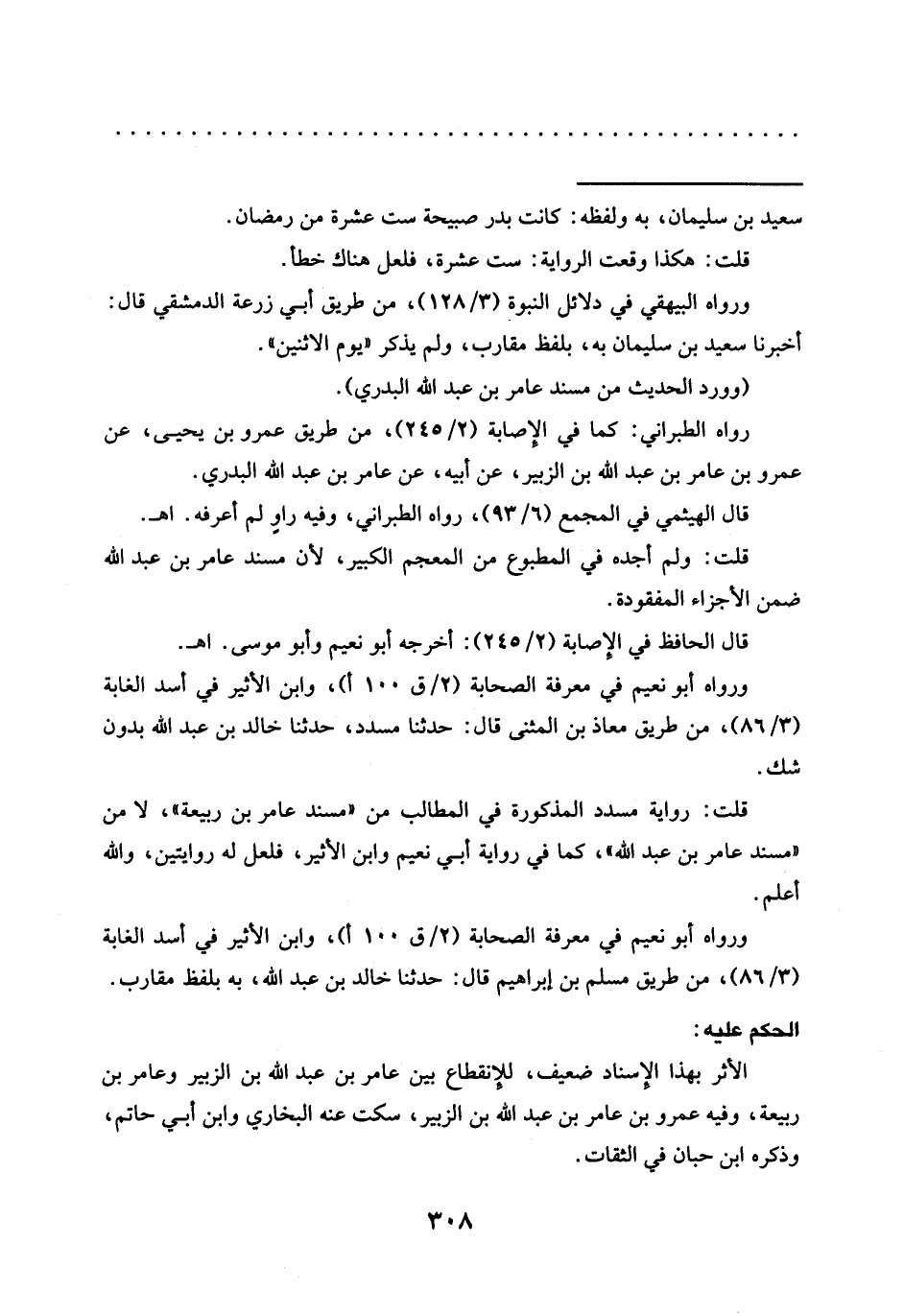 ورواه أبو نعيم في معرفة الصحابة (2/ ق 100 أ)، وابن الأثير في أسد الغابة 3/ 86)، من طريق معاذ بن المثنى قال: حدّثنا مسدّد، حدّثنا خالد بن عبد الله بدون شك قلت: رواية مسدّد المذكورة في المطالب من "مسند عامر بن ربيعة"، لا من "مسند عامر بن عبد الله"، كما في رواية أبي نعيم وابن الأثير، فلعل له روايتين، والله أعلم.