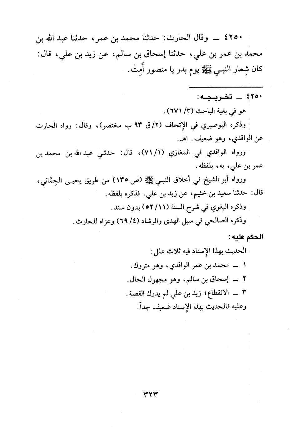 4250 - وَقَالَ الْحَارِثُ: حدثنا مُحَمَّدُ بْنُ عمر، حدثنا عَبْدُ اللَّهِ بْنُ مُحَمَّدِ بْنِ عُمَرَ بْنِ عَلِيٍّ، حدثنا إِسْحَاقُ بْنُ سَالِمٍ، عَنْ زَيْدِ بْنِ عَلِيٍّ، قَالَ: كَانَ §شِعَارُ النَّبِيِّ صَلَّى اللَّهُ عَلَيْهِ وَسَلَّمَ يَوْمَ بَدْرٍ يَا مَنْصُورُ أَمِتْ.