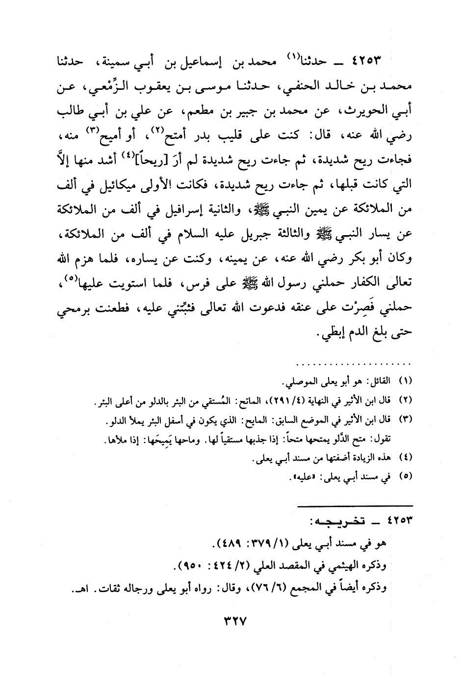 4253 - حدثنا مُحَمَّدُ بْنُ إِسْمَاعِيلَ بْنِ أَبِي سَمِينَةَ، حدثنا مُحَمَّدُ بْنُ خَالِدٍ الْحَنَفِيُّ، حدثنا مُوسَى بْنُ يَعْقُوبَ الزَّمْعِيُّ، عَنْ أَبِي الْحُوَيْرِثِ، عَنْ مُحَمَّدِ بْنِ جُبَيْرِ بْنِ مُطْعِمٍ، عَنْ عَلِيِّ بْنِ أَبِي طَالِبٍ رَضِيَ الله عَنْه، قَالَ: §كُنْتُ عَلَى قَلِيبِ بَدْرٍ أَمْتَحُ، أَوْ أَمِيحُ مِنْهُ، فَجَاءَتْ رِيحٌ شَدِيدَةٌ، ثُمَّ جَاءَتْ رِيحٌ شَدِيدَةٌ لَمْ أَرَ [رِيحًا] أَشَدَّ مِنْهَا إِلَّا الَّتِي كَانَتْ قَبْلَهَا، ثُمَّ جَاءَتْ رِيحٌ شَدِيدَةٌ، فَكَانَتِ الْأُولَى مِيكَائِيلَ فِي أَلْفٍ مِنَ الْمَلَائِكَةِ عَنْ يَمِينِ النَّبِيِّ صَلَّى اللَّهُ عَلَيْهِ وَسَلَّمَ، وَالثَّانِيَةُ إِسْرَافِيلَ فِي أَلْفٍ مِنَ الْمَلَائِكَةِ عَنْ يَسَارِ النَّبِيِّ صَلَّى اللَّهُ عَلَيْهِ وَسَلَّمَ والثالثة جبريل عليه السلام فِي أَلْفٍ مِنَ الْمَلَائِكَةِ، وَكَانَ أَبُو بَكْرٍ رَضِيَ الله عَنْه، عَنْ يَمِينِهِ، وَكُنْتُ عَنْ يَسَارِهِ، فَلَمَّا هزم الله تعالى الْكُفَّارَ حَمَلَنِي رَسُولُ اللَّهِ صَلَّى اللَّهُ عَلَيْهِ وَسَلَّمَ عَلَى فَرَسٍ، فَلَمَّا اسْتَوَيْتُ عَلَيْهَا، حَمَلَنِي فَصِرْتُ عَلَى عُنُقِهِ فدعوت الله تعالى فَثَبَّتَنِي عَلَيْهِ، فَطُعِنْتُ بِرُمْحِي حَتَّى بَلَغَ الدَّمُ إِبْطِي.