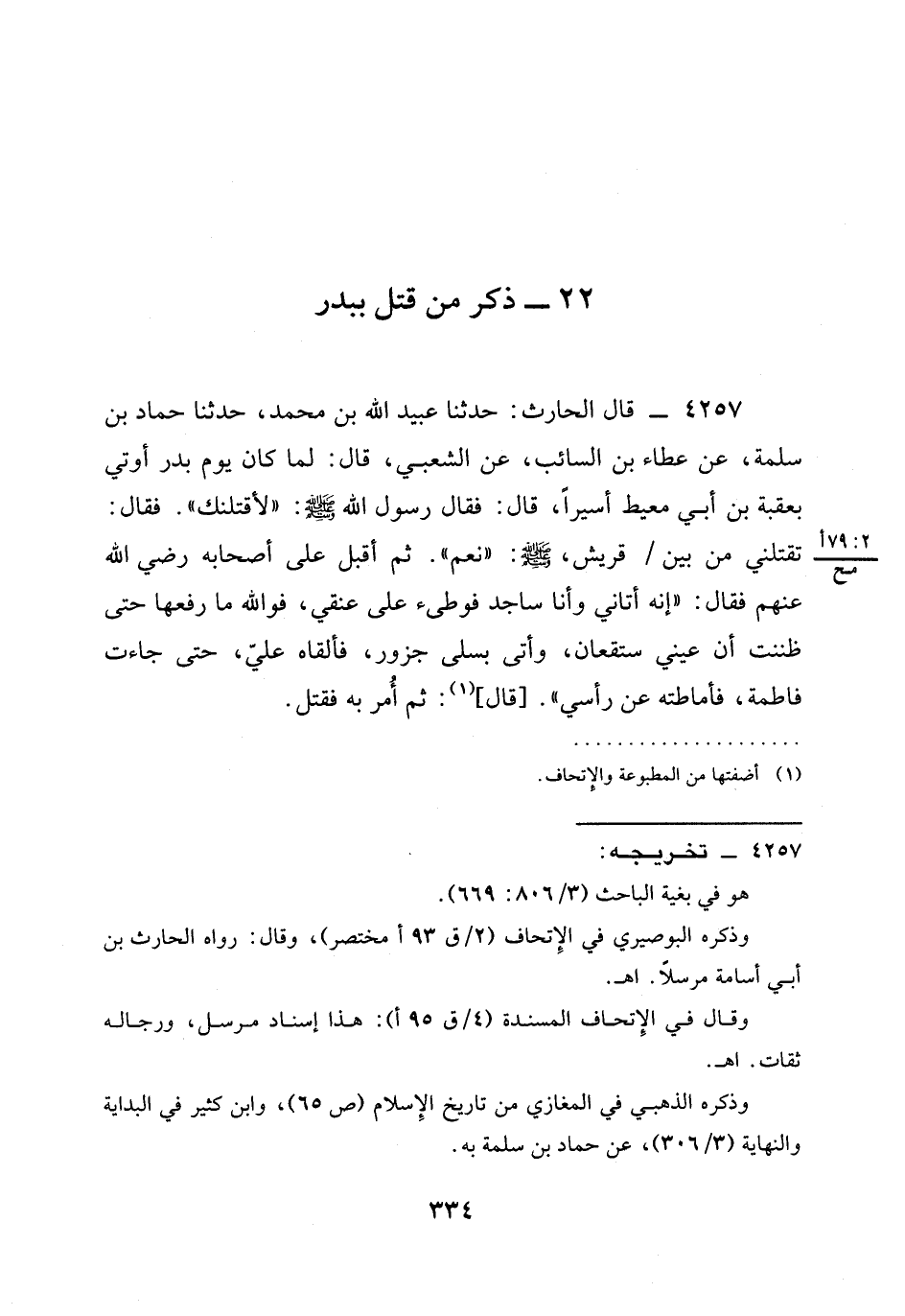 4257 - قَالَ الْحَارِثُ: حدثنا عُبَيْدُ اللَّهِ بْنُ مُحَمَّدٍ، حدثنا حَمَّادُ بْنُ سَلَمَةَ، عَنْ عَطَاءِ بْنِ السَّائِبِ، عَنِ الشَّعْبِيِّ، قَالَ: لَمَّا كَانَ يوم بدر أوتي بعُقْبَةَ بْنِ أَبِي مُعَيْطٍ أَسِيرًا، قَالَ: فَقَالَ رَسُولُ اللَّهِ صَلَّى اللَّهُ عَلَيْهِ وَسَلَّمَ: " §لَأَقْتُلَنَّكَ ". فَقَالَ: تَقْتُلُنِي مِنْ بَيْنِ / قُرَيْشٍ، صَلَّى اللَّهُ عَلَيْهِ وَسَلَّمَ: " نَعَمْ ". ثُمَّ أَقْبَلَ على أصحابه رَضِيَ الله عَنْهم فَقَالَ: " إِنَّهُ أَتَانِي وَأَنَا سَاجِدٌ فَوَطِئَ عَلَى عُنُقِي، فَوَاللَّهِ مَا رَفَعَهَا حَتَّى ظَنَنْتُ أَنَّ عَيْنَيَّ ستقعان، وأتى بسلى جَزُورٍ، فَأَلْقَاهُ عَلَيَّ، حَتَّى جَاءَتْ فَاطِمَةُ، فَأَمَاطَتْهُ عَنْ رَأْسِي ". [قَالَ] : ثُمَّ أَمَرَ بِهِ فَقُتِلَ.