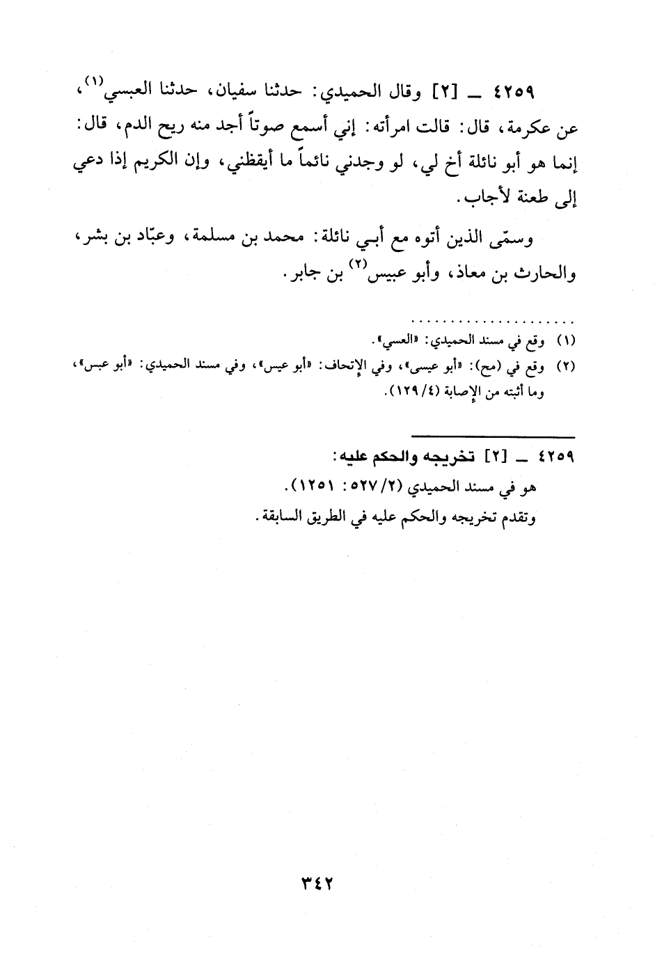 4259 -[2] وَقَالَ الْحُمَيْدِيُّ: حدثنا سُفْيَانُ، حدثنا الْعَبْسِيُّ، عَنْ عِكْرِمَةَ، قَالَ: قَالَتْ امْرَأَتُهُ: إِنِّي §أَسْمَعُ صَوْتًا أَجِدُ مِنْهُ رِيحَ الدَّمِ، قَالَ: إِنَّمَا هُوَ أَبُو نَائِلَةَ أَخٌ لِي، لَوْ وَجَدَنِي نَائِمًا مَا أَيْقَظَنِي، وَإِنَّ الْكَرِيمَ إِذَا دُعِيَ إِلَى طَعْنَةٍ لَأَجَابَ.