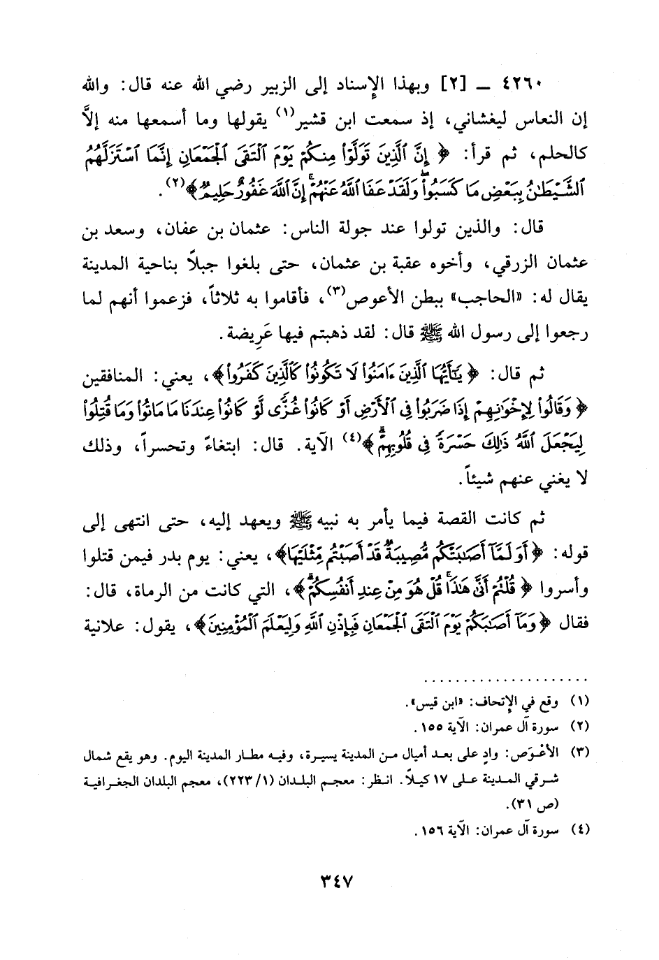 4260 -[2] وَبِهَذَا الْإِسْنَادِ إِلَى الزُّبَيْرِ رَضِيَ الله عَنْه قَالَ: وَاللَّهِ إِنَّ النُّعَاسَ لَيَغْشَانِي، إِذْ سَمِعْتُ ابْنَ قُشَيْرٍ يَقُولُهَا وَمَا أَسْمَعُهَا مِنْهُ إِلَّا كَالْحُلْمِ، ثُمَّ قَرَأَ: {§إِنَّ الَّذِينَ تَوَلَّوْا مِنْكُمْ يَوْمَ الْتَقَى الْجَمْعَانِ إِنَّمَا اسْتَزَلَّهُمُ الشَّيْطَانُ بِبَعْضِ مَا كَسَبُوا وَلَقَدْ عَفَا اللَّهُ عَنْهُمْ إِنَّ اللَّهَ غَفُورٌ حَلِيمٌ} .