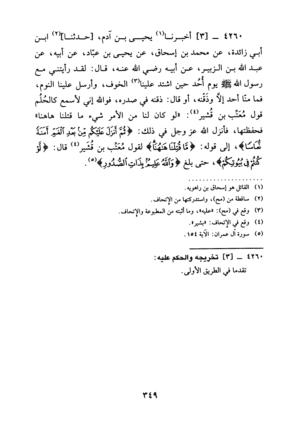 4260 -[3] أخبرنا يَحْيَى بْنُ آدَمَ، [حدثنا] ابْنُ أَبِي زَائِدَةَ، عَنْ مُحَمَّدِ بْنِ إِسْحَاقَ، عَنْ يَحْيَى بْنِ عَبَّادٍ، عَنْ أَبِيهِ، عَنْ عَبْدِ اللَّهِ بْنِ الزُّبَيْرِ، عَنْ أَبِيهِ رَضِيَ الله عَنْه، قَالَ: لَقَدْ §رَأَيْتُنِي مَعَ رَسُولِ اللَّهِ صَلَّى اللَّهُ عَلَيْهِ وَسَلَّمَ يَوْمَ أُحُدٍ حِينَ اشْتَدَّ عَلَيْنَا الْخَوْفُ، وَأُرْسِلَ عَلَيْنَا النَّوْمُ، فَمَا مِنَّا أَحَدٌ إِلَّا وذقنه، أَوْ قَالَ: ذَقَنُهُ فِي صَدْرِهِ، فَوَاللَّهِ إِنِّي لَأَسْمَعُ كَالْحُلْمِ قَوْلَ مُعَتِّبِ بْنِ قُشَيْرٍ: " لَوْ كَانَ لَنَا مِنَ الْأَمْرِ شَيْءٌ ما قتلنا هاهنا " فَحَفِظْتُهَا، فأنزل الله عز وجل فِي ذَلِكَ: {ثُمَّ أَنْزَلَ عَلَيْكُمْ مِنْ بَعْدَ الْغَمِّ أَمَنَةً نُعَاسًا} ، إِلَى قَوْلِهِ: {مَا قُتِلْنَا ههنا} لِقَوْلِ مُعَتِّبِ بْنِ قُشَيْرٍ قَالَ: {لَوْ كُنْتُمْ فِي بُيُوتِكُمْ} ، حَتَّى بَلَغَ {وَاللَّهُ عَلِيمٌ بِذَاتِ الصُّدُورِ}