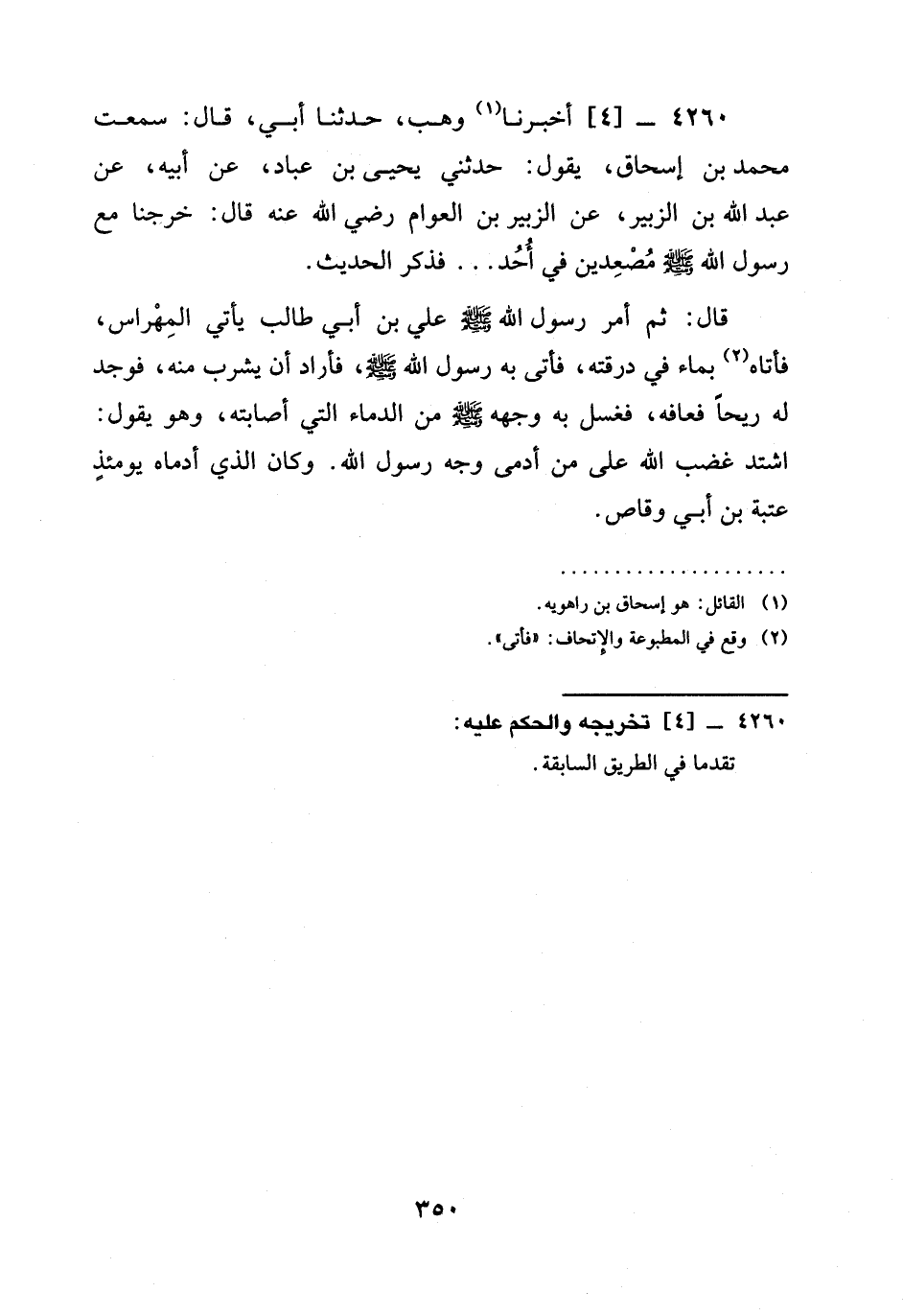 4260 -[4] أَخْبَرَنَا وَهْبٌ، حدثنا أَبِي، قَالَ: سَمِعْتُ مُحَمَّدَ بْنَ إِسْحَاقَ، يَقُولُ: حَدَّثَنِي يَحْيَى بْنُ عَبَّادٍ، عَنْ أَبِيهِ، عَنْ عَبْدِ اللَّهِ بْنِ الزُّبَيْرِ، عَنِ الزُّبَيْرِ بْنِ الْعَوَّامِ رَضِيَ الله عَنْه قَالَ: خَرَجْنَا مَعَ رَسُولِ اللَّهِ صَلَّى اللَّهُ عَلَيْهِ وَسَلَّمَ مُصْعِدِينَ فِي أُحُدٍ ... فَذَكَرَ الْحَدِيثَ.