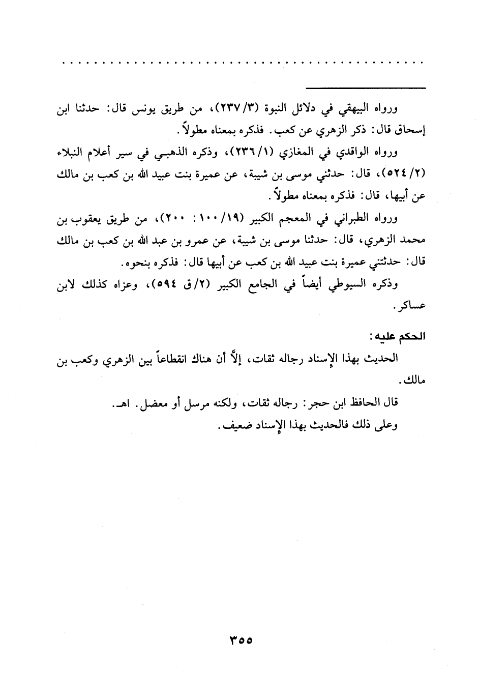 ورواه الطبراني في المعجم الكبير (19/ 100: 200)، من طريق يعقوب بن محمد الزهري، قال: حدّثنا موسى بن شيبة، عن عمرو بْنِ عَبْدِ اللَّهِ بْنِ كَعْبِ بْنِ مَالِكٍ قال: حدثتني عميرة بنت عبيد الله بن كعب عن أبيها قال: فذكره بنحوه.