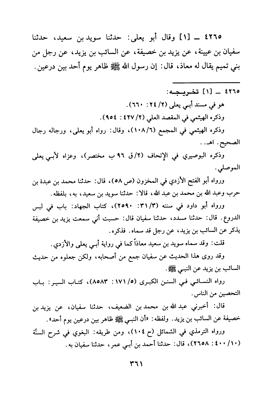 4265 -[1] وَقَالَ أَبُو يَعْلَى: حدثنا سُوَيْدُ بْنُ سَعِيدٍ، حدثنا سُفْيَانُ بْنُ عُيَيْنَةَ، عَنْ يَزِيدَ بْنِ خُصَيْفَةَ، عَنِ السَّائِبِ بْنِ يَزِيدَ، عَنْ رَجُلٍ مِنْ بَنِي تَمِيمٍ يُقَالُ لَهُ مُعَاذٌ، قَالَ: إِنَّ رَسُولَ اللَّهِ صَلَّى اللَّهُ عَلَيْهِ وَسَلَّمَ §ظَاهَرَ يَوْمَ أُحُدٍ بَيْنَ دِرْعَيْنِ -[364]-.