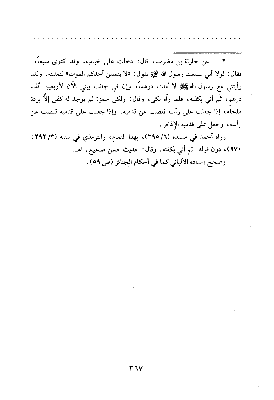 = 2 - عن حارثة بن مضرب، قال: دخلت على خباب، وقد اكتوى سبعًا، فقال: لَوْلَا أَنِّي سَمِعْتُ رَسُولَ اللَّهِ -صَلَّى اللَّهُ عليه وسلم-: "لا يتمنين أحدكم الموت " لتمنيته. ولقد رَأَيْتُنِي مَعَ رَسُولِ اللَّهِ -صَلَّى اللَّهُ عَلَيْهِ وَسَلَّمَ- لا أملك درهمًا، وإن في جانب بيتي الآن لأربعين ألف درهمٍ، ثم أتي بكفنه، فلما رآه بكى، وقال: ولكن حمزة لم يوجد له كفن إلَّا بردة ملحاء، إذا جعلت على رأسه قلصت عن قدميه، وإذا جعلت على قدميه قلصت عن رأسه، وجعل على قدميه الإِذخر.