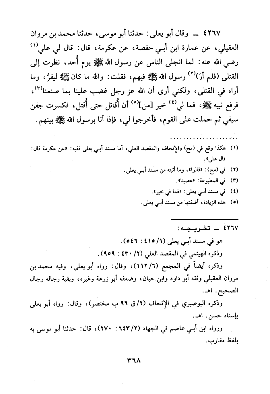 4267 - وَقَالَ أَبُو يَعْلَى: حدثنا أَبُو مُوسَى، حدثنا مُحَمَّدُ بْنُ مَرْوَانَ الْعُقَيْلِيُّ، عَنْ عُمَارَةَ ابن أَبِي حَفْصَةَ، عَنْ عِكْرِمَةَ، قَالَ: قَالَ لِي عَلِيٌّ رَضِيَ الله عَنْه: §لَمَّا انْجَلَى النَّاسُ عَنْ رَسُولِ اللَّهِ صَلَّى اللَّهُ عَلَيْهِ وَسَلَّمَ يَوْمَ أُحُدٍ، نَظَرْتُ إِلَى الْقَتْلَى (فَلَمْ أَرَ) رَسُولَ اللَّهِ صَلَّى اللَّهُ عَلَيْهِ وَسَلَّمَ فِيهِمْ، فَقُلْتُ: وَاللَّهِ مَا كَانَ صَلَّى اللَّهُ عَلَيْهِ وَسَلَّمَ لِيَفِرَّ، وَمَا أُرَاهُ فِي الْقَتْلَى، وَلَكِنِّي أَرَى أن الله عز وجل غَضِبَ عَلَيْنَا بِمَا صنعنا، فَرَفَعَ نَبِيَّهُ صَلَّى اللَّهُ عَلَيْهِ وَسَلَّمَ، فَمَا لِي خَيْرٌ [مِنْ] أَنْ أُقَاتِلَ حَتَّى أُقْتَلَ، فَكَسَرْتُ جَفْنَ سَيْفِي ثُمَّ حَمَلْتُ عَلَى الْقَوْمِ، فأخرجوا لِي، فَإِذَا أَنَا بِرَسُولِ اللَّهِ صَلَّى اللَّهُ عَلَيْهِ وَسَلَّمَ بَيْنَهُمْ.