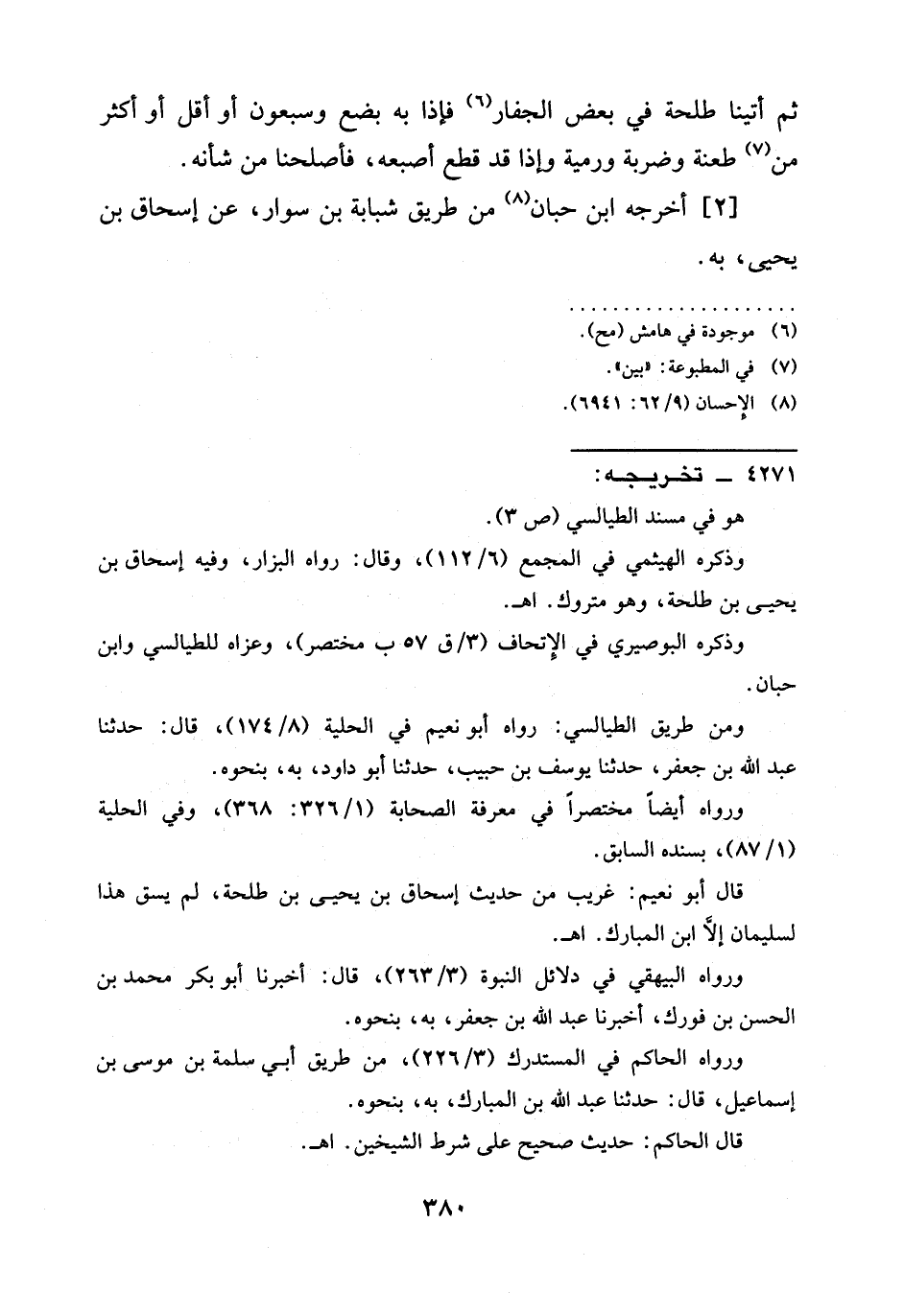 ثم أتينا طلحة في بعض الْجِفَارِ (¬6) فَإِذَا بِهِ بِضْعٌ وَسَبْعُونَ أَوْ أَقَلُّ أَوْ أَكْثَرُ مِنْ (¬7) طَعْنَةٍ وَضَرْبَةٍ وَرَمْيَةٍ وَإِذَا قد قطع أصبعه، فأصلحنا من شأنه.