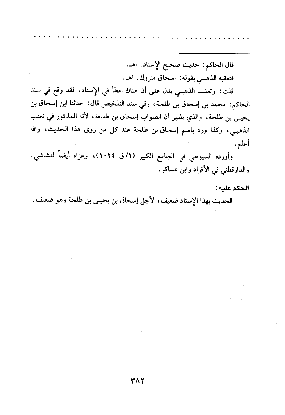 قلت: وتعقب الذهبي يدلا على أن هناك خطأ في الإِسناد، فقد وقع في سند الحاكم: محمد بن إسحاق بن طلحة، وفي سند التلخيص قال: حدّثنا ابن إسحاق بن يحيى بن طلحة، والذي يظهر أن الصواب إسحاق بن طلحة؛ لأنه المذكور في تعقب الذهبي، وكذا ورد باسم إسحاق بن طلحة عند كل من روى هذا الحديث، والله أعلم.