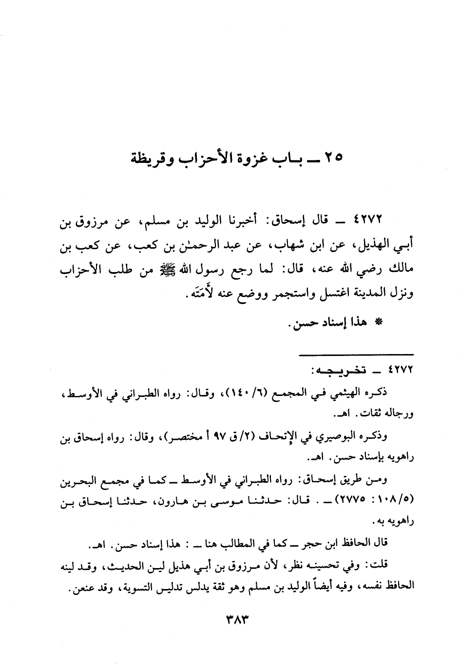 4272 - قَالَ إِسْحَاقُ: أخبرنا الْوَلِيدُ بْنُ مُسْلِمٍ، عَنْ مَرْزُوقِ بْنِ أَبِي الْهُذَيْلِ، عَنِ ابْنِ شِهَابٍ، عَنْ عَبْدِ الرَّحْمَنِ بْنِ كَعْبِ، عَنْ كَعْبِ بْنِ مَالِكٍ رَضِيَ الله عَنْه، قَالَ: §لَمَّا رَجَعَ رَسُولُ اللَّهِ صَلَّى اللَّهُ عَلَيْهِ وَسَلَّمَ مِنْ طَلَبِ الْأَحْزَابِ وَنَزَلَ الْمَدِينَةَ اغْتَسَلَ وَاسْتَجْمَرَ وَوَضَعَ عَنْهُ لَأْمَتَهُ.