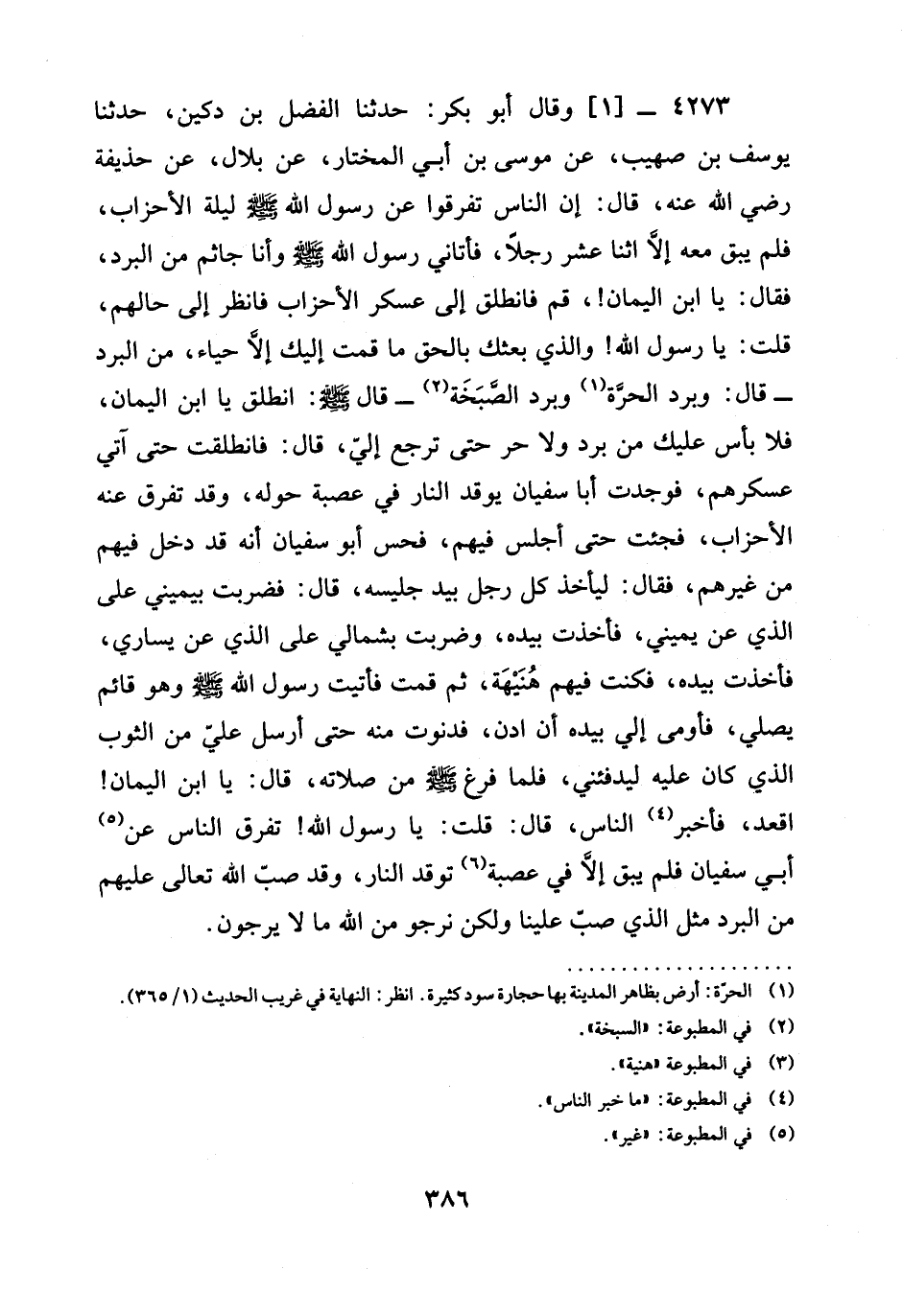 4273 -[1] وَقَالَ أَبُو بَكْرٍ: حدثنا الْفَضْلُ بْنُ دُكَيْنٍ، حدثنا يُوسُفُ بْنُ صُهَيْبٍ، عَنْ مُوسَى بْنِ أَبِي الْمُخْتَارِ، عَنْ بِلَالٍ، عَنْ حُذَيْفَةَ رَضِيَ الله عَنْه، قَالَ: إِنَّ النَّاسِ تَفَرَّقُوا عَنْ رَسُولِ اللَّهِ صَلَّى اللَّهُ عَلَيْهِ وَسَلَّمَ لَيْلَةَ الْأَحْزَابِ، فَلَمْ يَبْقَ مَعَهُ إِلَّا اثْنَا عَشَرَ رَجُلًا، فَأَتَانِي رَسُولُ اللَّهِ صَلَّى اللَّهُ عَلَيْهِ وَسَلَّمَ وَأَنَا جَاثِمٌ مِنَ الْبَرْدِ، فَقَالَ: يَا ابْنَ الْيَمَانِ! ، §قُمْ فَانْطَلِقْ إِلَى عَسْكَرِ الْأَحْزَابِ فَانْظُرْ إِلَى حَالِهِمْ، قُلْتُ: يَا رَسُولَ اللَّهِ! وَالَّذِي بَعَثَكَ بِالْحَقِّ مَا قُمْتُ إِلَيْكَ إِلَّا حَيَاءً، مِنَ الْبَرْدِ - قَالَ: وَبَرَدُ الْحَرَّةِ وَبَرَدُ الصبخة - قَالَ صَلَّى اللَّهُ عَلَيْهِ وَسَلَّمَ: انْطَلِقْ يَا ابْنَ الْيَمَانِ، فَلَا بَأْسَ عَلَيْكَ مِنْ بَرْدٍ وَلَا حَرٍّ حَتَّى تَرْجِعَ إِلَيَّ، قَالَ: فَانْطَلَقْتُ حَتَّى آتِيَ عَسْكَرَهُمْ، فَوَجَدْتُ أَبَا سُفْيَانَ يُوقِدُ النَّارَ فِي عُصْبَةٍ حَوْلَهُ، وَقَدْ تَفَرَّقَ عَنْهُ الْأَحْزَابُ، فَجِئْتُ حَتَّى أَجْلِسَ فِيهِمْ، فَحَسَّ أَبُو سُفْيَانَ أَنَّهُ قَدْ دَخَلَ فِيهِمْ منْ غَيْرِهِمْ، فَقَالَ: لِيَأْخُذْ كُلُّ رَجُلٍ بِيَدِ جَلِيسِهِ، قَالَ: فَضَرَبْتُ بِيَمِينِي عَلَى الَّذِي عَنْ يَمِينِي، فَأَخَذْتُ بِيَدِهِ، وَضَرَبْتُ بِشِمَالِي عَلَى الَّذِي عَنْ يَسَارِي، فَأَخَذْتُ بِيَدِهِ، فَكُنْتُ فِيهِمْ هنيهة، ثُمَّ قُمْتُ فَأَتَيْتُ رَسُولَ اللَّهِ صَلَّى اللَّهُ عَلَيْهِ وَسَلَّمَ وَهُوَ قَائِمٌ يُصَلِّي، فأومى إِلَيَّ بِيَدِهِ أَنِ ادْنُ، فَدَنَوْتُ مِنْهُ حَتَّى أَرْسَلَ عَلَيَّ مِنَ الثَّوْبِ الَّذِي كَانَ عَلَيْهِ لِيُدْفِئَنِي، فَلَمَّا فَرَغَ صَلَّى اللَّهُ عَلَيْهِ وَسَلَّمَ مِنْ صَلَاتِهِ، قَالَ: يَا ابْنَ اليمان! اقعد، فأخبر النَّاسِ، قَالَ: قُلْتُ: يَا رَسُولَ اللَّهِ! تَفَرَّقَ النَّاسُ عَنْ أَبِي سُفْيَانَ فَلَمْ يَبْقَ إِلَّا فِي عُصْبَةٍ تُوقِدُ النَّارَ، وَقَدْ صب الله تعالى عَلَيْهِمْ مِنَ الْبَرْدِ مِثْلَ الَّذِي صب علينا ولكن نَرْجُو من الله مالا يَرْجُونَ.