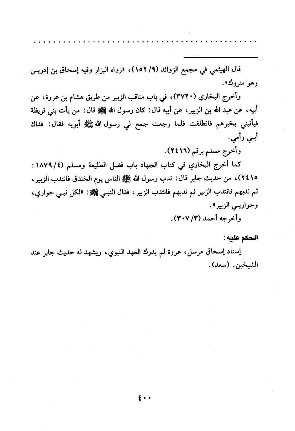 إسناد إسحاق مرسل، عروة لم يدرك العهد النبوي، ويشهد له حديث جابر عند الشيخين. (سعد).