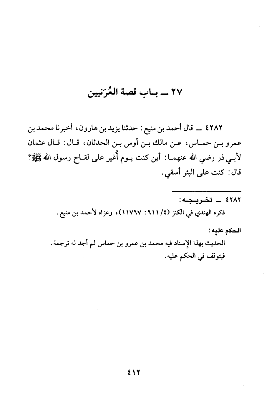 4282 - قَالَ أَحْمَدُ بْنُ مَنِيعٍ: حدثنا يَزِيدُ بن هارون، أخبرنا مُحَمَّدُ بْنُ عمرو بن حماس، عَنْ مَالِكِ بْنِ أَوْسِ بْنِ الْحَدَثَانِ، قَالَ: قَالَ عُثْمَانُ لأبي ذر رَضِيَ الله عَنْهما: §أَيْنَ كُنْتَ يَوْمَ أُغِيرَ عَلَى لِقَاحِ رَسُولِ اللَّهِ صَلَّى اللَّهُ عَلَيْهِ وَسَلَّمَ؟ قَالَ: كُنْتُ عَلَى الْبِئْرِ أَسْقِي.