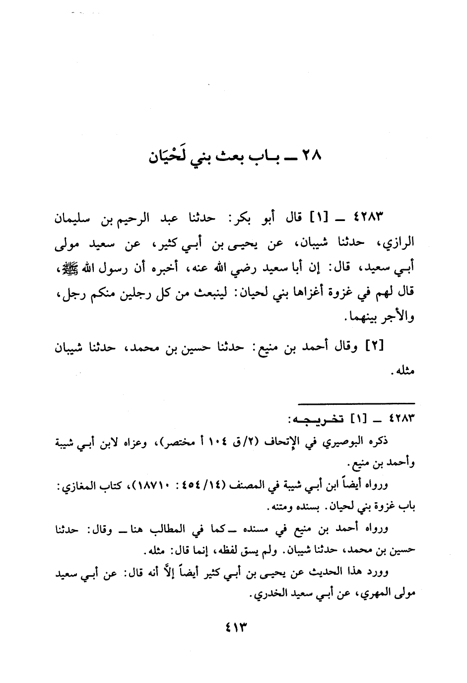 4283 -[1] قَالَ أَبُو بَكْرٍ: حدثنا عَبْدُ الرَّحِيمِ بْنُ سُلَيْمَانَ الرَّازِيُّ، حدثنا شَيْبَانُ، عَنْ يَحْيَى بْنِ أَبِي كَثِيرٍ، عَنْ سَعِيدٍ مَوْلَى أَبِي سَعِيدٍ، قَالَ: إِنَّ أَبَا سَعِيدٍ رَضِيَ الله عَنْه، أَخْبَرَهُ أَنَّ رَسُولَ اللَّهِ صَلَّى اللَّهُ عَلَيْهِ وَسَلَّمَ، قَالَ لَهُمْ فِي غَزْوَةٍ أَغْزَاهَا بَنِي لِحْيَانَ: §لينبعث مِنْ كُلِّ رَجُلَيْنِ مِنْكُمْ رَجُلٌ، وَالْأَجْرُ بَيْنَهُمَا.