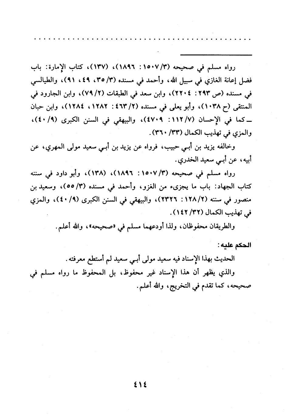 رواه مسلم في صحيحه (3/ 1507: 1896)، (138)، وأبو داود في سننه كتاب الجهاد: باب ما يجزئ من الغزو، وأحمد في مسنده (3/ 55)، وسعيد بن منصور في سننه (2/ 128: 2326)، والبيهقي في السنن الكبرى (9/ 40)، والمزي في تهذيب الكمال (32/ 142).