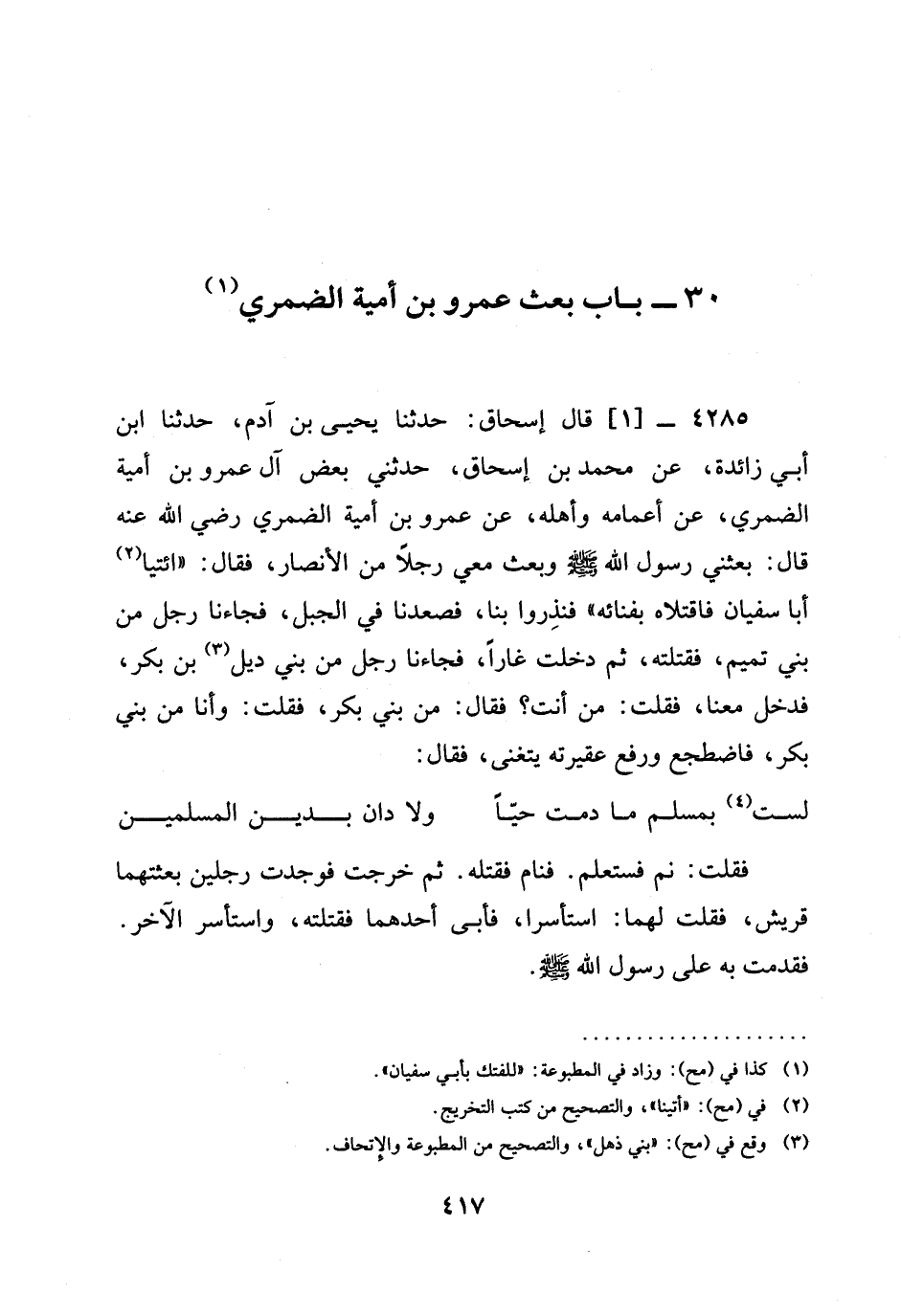 4285 -[1] قَالَ إِسْحَاقُ: حَدَّثَنَا يَحْيَى بْنُ آدَمَ، حدثنا ابْنُ أَبِي زَائِدَةَ، عَنْ مُحَمَّدِ بْنِ إِسْحَاقَ، حَدَّثَنِي بَعْضُ آلِ عَمْرِو بْنِ أُمَيَّةَ الضَّمْرِيِّ، عَنْ أَعْمَامِهِ وَأَهْلِهِ، عَنْ عَمْرِو بْنِ أُمَيَّةَ الضَّمْرِيِّ رَضِيَ الله عَنْه قَالَ: §بَعَثَنِي رَسُولُ اللَّهِ صَلَّى اللَّهُ عَلَيْهِ وَسَلَّمَ وَبَعَثَ مَعِي رَجُلًا مِنَ الْأَنْصَارِ، فَقَالَ: " ائْتِيَا أَبَا سُفْيَانَ فَاقْتُلَاهُ بِفِنَائِهِ " فَنَذَرُوا بِنَا، فَصَعِدْنَا فِي الْجَبَلِ، فَجَاءَنَا رَجُلٌ مِنْ بَنِي تَمِيمٍ، فَقَتَلْتُهُ، ثُمَّ دَخَلْتُ غَارًا، فَجَاءَنَا رَجُلٌ مِنْ بَنِي دِيلِ بْنِ بَكْرٍ، فَدَخَلَ مَعَنَا، فَقُلْتُ: مَنْ أَنْتَ؟ فَقَالَ: مِنْ بَنِي بَكْرٍ، فَقُلْتُ: وَأَنَا مِنْ بَنِي بَكْرٍ، فَاضْطَجَعَ وَرَفَعَ عَقِيرَتَهُ يَتَغَنَّى، فَقَالَ: