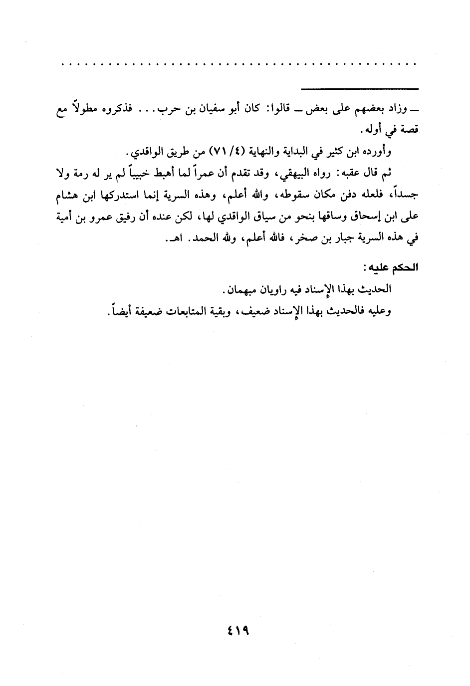 ثم قال عقبه: رواه البيهقي، وقد تقدم أن عمرًا لما أهبط خبيبًا لم ير له رمة ولا جسدًا، فلعله دفن مكان سقوطه، والله أعلم، وهذه السرية إنما استدركها ابن هشام على ابن إسحاق وساقها بنحو من سياق الواقدي لها, لكن عنده أن رفيق عمرو بن أُمية في هذه السرية جبار بن صخر، فالله أعلم، ولله الحمد. اهـ.