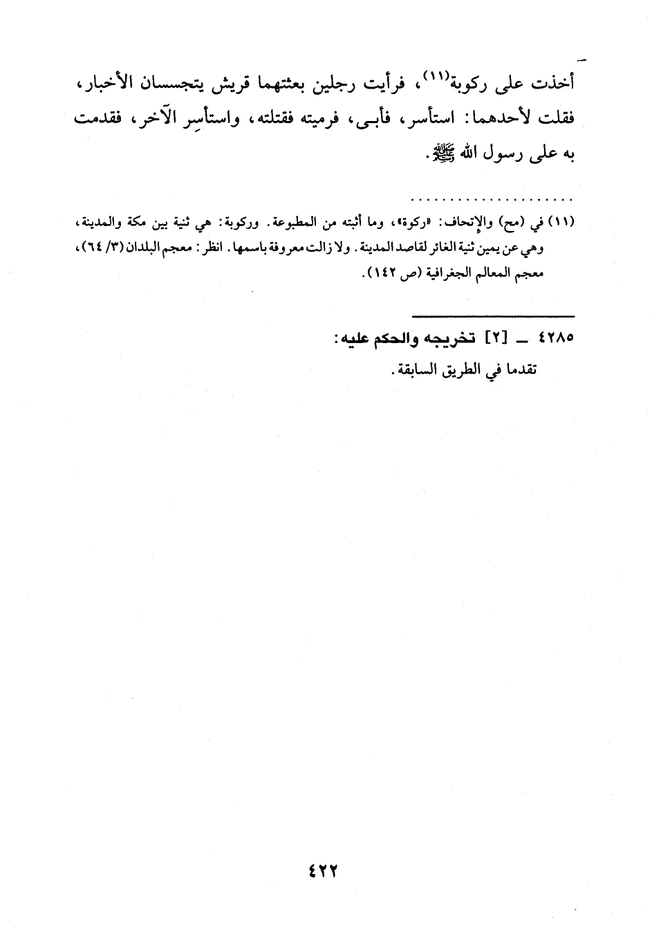 أخذت على ركوبة (¬11)، فرأيت رجلين بعثتهما قريش يتجسسان الْأَخْبَارَ، فَقُلْتُ لِأَحَدِهِمَا: اسْتَأْسِرْ، فَأَبَى، فَرَمَيْتُهُ فَقَتَلْتُهُ، واستأسِر الْآخَرُ، فَقَدِمْتُ بِهِ عَلَى رَسُولِ اللَّهِ -صَلَّى اللَّهُ عَلَيْهِ وسلم-.