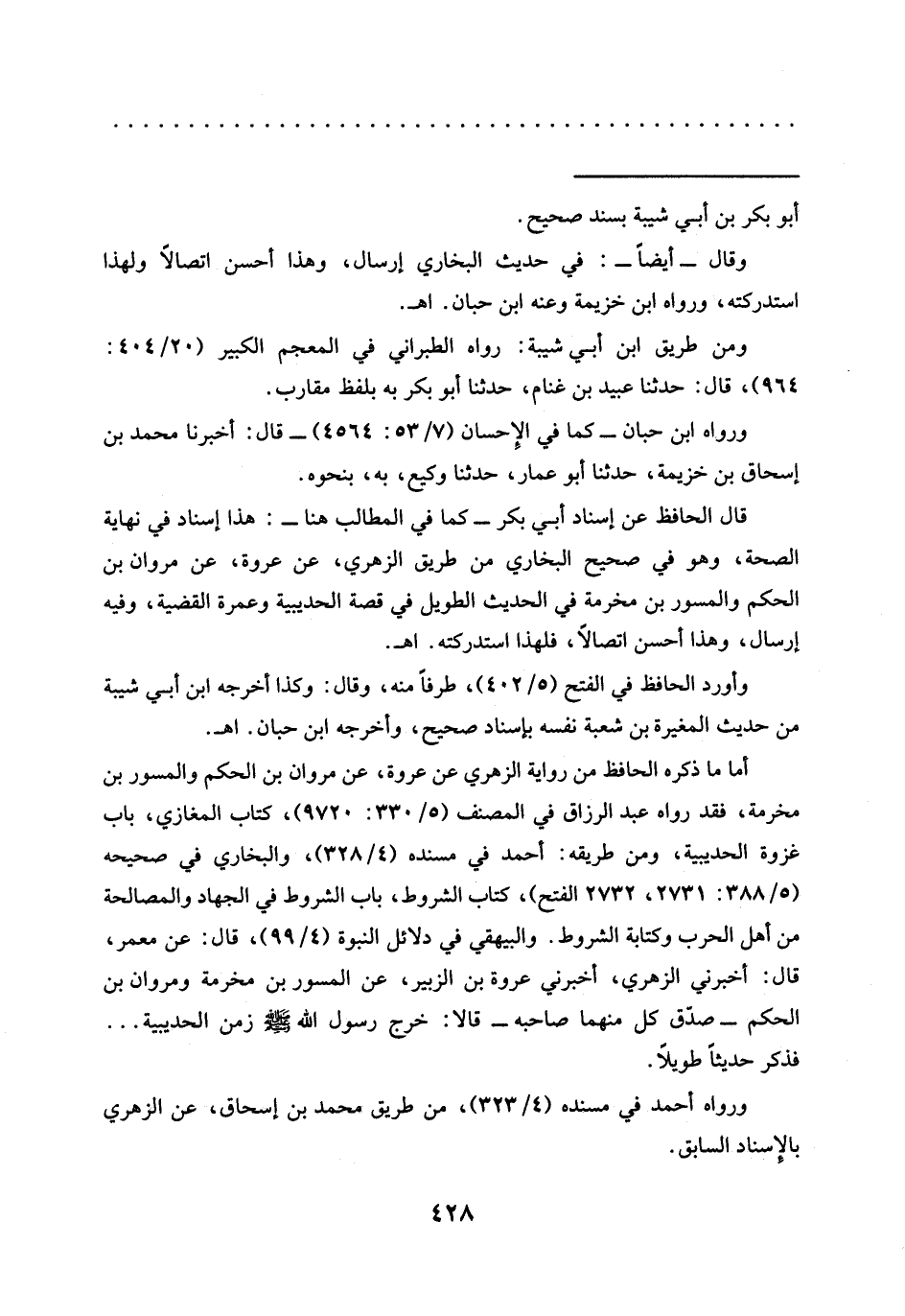 قال الحافظ عن إسناد أبي بكر -كما في المطالب هنا-: هَذَا إِسْنَادٌ فِي نهايَةِ الصِّحَّةِ، وَهُوَ فِي صَحِيحِ الْبُخَارِيِّ مِنْ طَرِيقِ الزُّهْرِيِّ، عَنْ عُرْوَةَ، عَنْ مَرْوَانَ بْنِ الْحَكَمِ وَالْمِسْوَرِ بْنِ مَخْرَمَةَ فِي الْحَدِيثِ الطَّوِيلِ فِي قِصَّةِ الْحُدَيْبِيَةِ وَعُمْرَةِ الْقَضِيَّةِ، وَفِيهِ إِرْسَالٌ، وَهَذَا أَحْسَنُ اتِّصَالًا، فَلِهَذَا استدركته. اهـ.