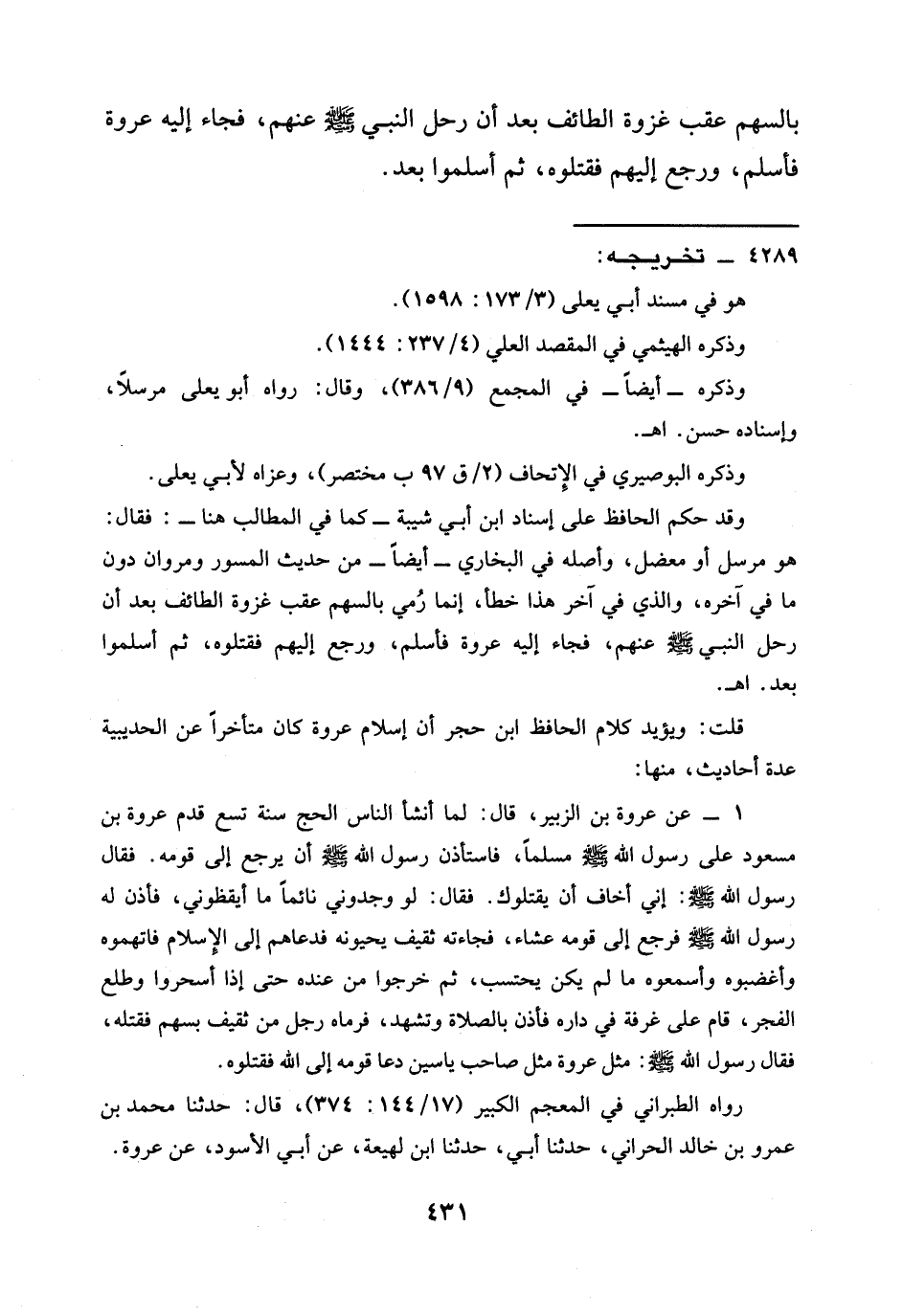 وقد حكم الحافظ على إسناد ابن أبي شيبة -كما في المطالب هنا-: فقال: هو مُرْسَلٌ أَوْ مُعْضَلٌ، وَأَصْلُهُ فِي الْبُخَارِيِّ -أَيْضًا- مِنْ حَدِيثِ الْمِسْوَرِ وَمَرْوَانَ دُونَ مَا فِي آخره، والذي في آخر هذا خطأ، إِنَّمَا رُمي بِالسَّهْمِ عَقِبَ غَزْوَةِ الطَّائِفِ بَعْدَ أَنْ رَحَلَ النَّبِيُّ - صَلَّى اللَّهُ عَلَيْهِ وَسَلَّمَ - عَنْهُمْ، فَجَاءَ إِلَيْهِ عُرْوَةُ فَأَسْلَمَ، وَرَجَعَ إِلَيْهِمْ فقتلوه، ثم أسلموا بعد. اهـ.