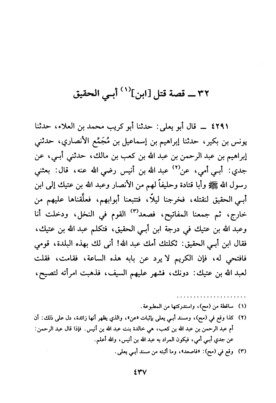 4291 - قَالَ أَبُو يَعْلَى: حدثنا أَبُو كُرَيْبٍ مُحَمَّدُ بْنُ الْعَلَاءِ، حدثنا يُونُسُ بْنُ بُكَيْرٍ، حدثنا إِبْرَاهِيمُ بْنُ إِسْمَاعِيلَ بْنِ مُجَمِّعٍ الْأَنْصَارِيُّ، حَدَّثَنِي إِبْرَاهِيمُ بْنُ عَبْدِ الرَّحْمَنِ بْنِ عَبْدِ اللَّهِ بْنِ كَعْبِ بْنِ مَالِكٍ، حَدَّثَنِي أَبِي، عَنْ جَدِّي: أَبِي أُمِّي، عَنْ عَبْدِ اللَّهِ بْنِ أُنَيْسٍ رَضِيَ الله عَنْه، قَالَ: §بَعَثَنِي رَسُولُ اللَّهِ صَلَّى اللَّهُ عَلَيْهِ وَسَلَّمَ وَأَبَا قَتَادَةَ وَحَلِيفًا لَهُمْ مِنَ الْأَنْصَارِ وَعَبْدَ اللَّهِ بْنَ عَتِيكٍ إِلَى ابْنِ أَبِي الْحُقَيْقِ لِنَقْتُلَهُ، فَخَرَجْنَا لَيْلًا، فَتَتَبَّعْنَا أَبْوَابَهُمْ، فعلقناها عَلَيْهِمْ مِنْ خَارِجٍ، ثُمَّ جَمَعْنَا الْمَفَاتِيحَ، فصعد الْقَوْمُ فِي النَّخْلِ، وَدَخَلْتُ أَنَا وَعَبْدُ اللَّهِ بْنُ عَتِيكٍ فِي دَرَجَةِ ابْنِ أَبِي الْحُقَيْقِ، فَتَكَلَّمَ عَبْدُ اللَّهِ بْنُ عَتِيكٍ، فَقَالَ ابْنُ أَبِي الْحُقَيْقِ: ثَكِلَتْكَ أُمُّكَ عَبْدَ اللَّهِ! أَنَّى لَكَ بِهَذِهِ البلدة، قُومِي فَافْتَحِي لَهُ، فَإِنَّ الْكَرِيمَ لَا يُرَدُّ عَنْ بَابِهِ هَذِهِ السَّاعَةَ، فَقَامَتْ، فَقُلْتُ لِعَبْدِ اللَّهِ بْنِ عَتِيكٍ: دُونَكَ، فَشَهَرَ عليهم السَّيْفَ، فَذَهَبَتِ امْرَأَتُهُ لِتَصِيحَ،