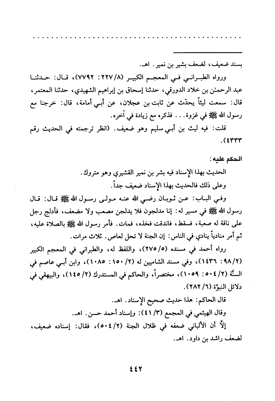وفي الباب: عن ثوبان رضي الله عنه مَوْلَى رَسُولِ اللَّهِ -صَلَّى اللَّهُ عَلَيْهِ وَسَلَّمَ- قَالَ: قَالَ رَسُولُ اللَّهِ -صَلَّى اللَّهُ عَلَيْهِ وسلم- في مسير له: إنا مدلجون فلا يدلجن مصعب ولا مضعف، فأدلج رجل على ناقة له صعبة، فسقط، فاندقت فخذه، فمات. فَأَمَرَ رَسُولُ اللَّهِ -صَلَّى اللَّهُ عَلَيْهِ وَسَلَّمَ- بالصلاة عليه، ثم أمر مناديًا ينادي في الناس: إن الجنة لا تحل لعاص. ثلاث مرات.