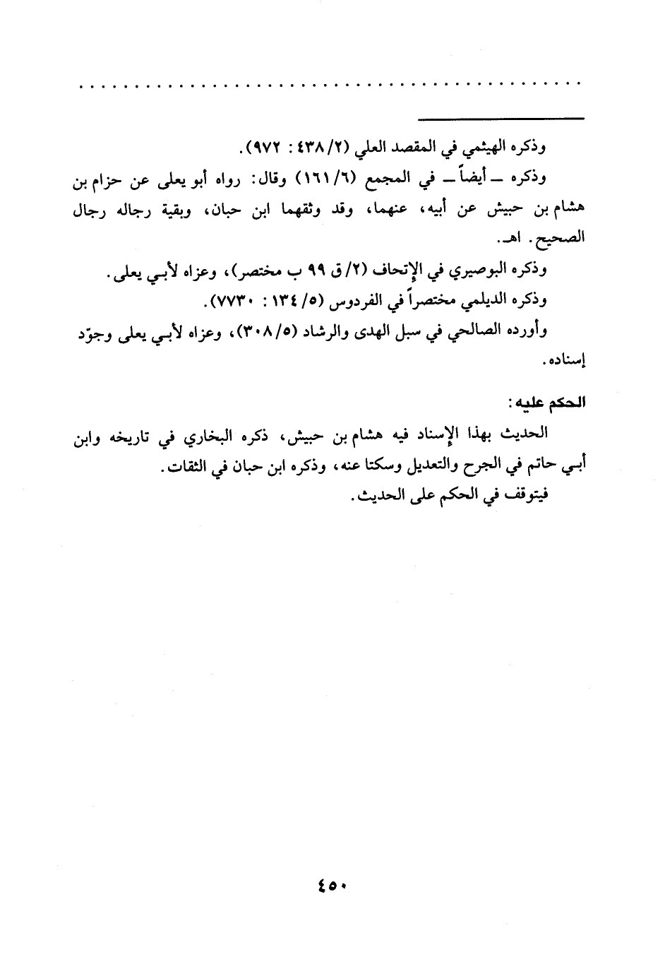 وذكره -أيضًا- في المجمع (6/ 161) وقال: رواه أبو يعلى عَنْ حِزَامِ بْنِ هِشَامِ بْنِ حُبَيْشٍ عَنْ أبيه، عنهما، وقد وثقهما ابن حبّان، وبقية رجاله رجال الصحيح. اهـ.
