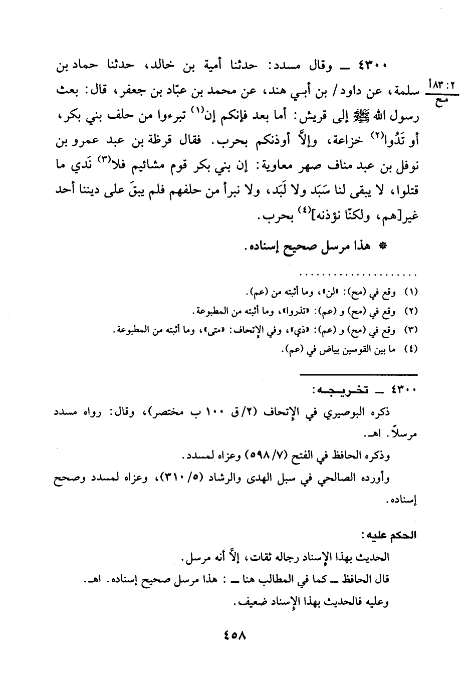 4300 - وَقَالَ مُسَدَّدٌ: حدثنا أُمَيَّةُ بْنُ خَالِدٍ، حدثنا حَمَّادُ بْنُ سَلَمَةَ، عَنْ دَاوُدَ / بْنِ أَبِي هِنْدٍ، عَنْ محمد بن عباد بْنِ جَعْفَرٍ، قَالَ: §بَعَثَ رَسُولُ اللَّهِ صَلَّى اللَّهُ عَلَيْهِ وَسَلَّمَ إِلَى قُرَيْشٍ: أَمَّا بَعْدُ فَإِنَّكُمْ إِنْ تَبْرَءُوا مِنْ حِلْفِ بَنِي بَكْرٍ، أَوْ تَدُوا خُزَاعَةَ، وَإِلَّا أُوذِنَكُمْ بِحَرْبٍ. فَقَالَ قَرَظَةُ بْنُ عَبْدِ عَمْرِو بْنِ نَوْفَلِ بْنِ عَبْدِ مَنَافِ صِهْرُ مُعَاوِيَةَ: إِنَّ بَنِي بَكْرٍ قَوْمٌ مَشَائِيمُ فَلَا نَدِي مَا قتلوا، لا يَبْقَى لَنَا سَبَدٌ وَلَا لَبَدٌ، وَلَا نَبْرَأُ مِنْ حِلْفِهِمْ فَلَمْ يَبْقَ عَلَى ديننا أحد غير [هم، وَلَكِنَّا نُؤْذِنُهُ] بِحَرْبٍ.