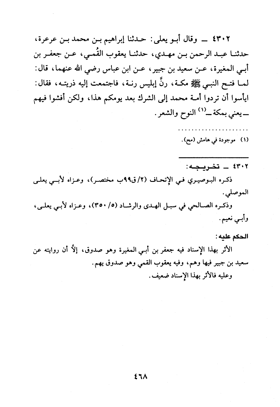 4302 - وَقَالَ أَبُو يَعْلَى: حَدَّثَنَا إِبْرَاهِيمُ بْنُ مُحَمَّدِ بْنِ عَرْعَرَةَ، حدثنا عَبْدُ الرَّحْمَنِ بْنُ مَهْدِيٍّ، حدثنا يَعْقُوبُ الْقُمِّيُّ، عَنْ جَعْفَرِ بْنِ أَبِي الْمُغِيرَةِ، عَنْ سَعِيدِ بْنِ جُبَيْرٍ، عَنِ ابْنِ عَبَّاسٍ رَضِيَ الله عَنْهُمَا، قَالَ: §لَمَّا فَتَحَ النَّبِيُّ صَلَّى اللَّهُ عَلَيْهِ وَسَلَّمَ مَكَّةَ، رَنَّ إِبْلِيسُ رَنَّةً، فَاجْتَمَعَتْ إِلَيْهِ ذُرِّيَّتُهُ، فَقَالَ: ايأسوا أَنْ تَرُدُّوا أُمَّةَ مُحَمَّدٍ إِلَى الشِّرْكِ بَعْدَ يَوْمِكُمْ هَذَا، وَلَكِنْ أَفْشُوا فِيهِمْ - يَعْنِي بِمَكَّةَ - النَّوْحَ وَالشِّعْرَ.