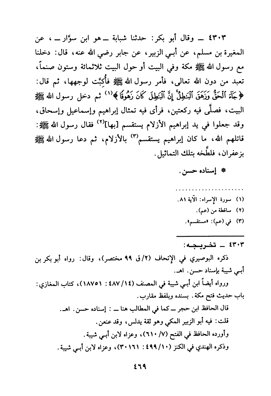 4303 - وَقَالَ أَبُو بَكْرٍ: حدثنا شَبَابَةُ - هُوَ ابْنُ سَوَّارٍ -، عَنِ الْمُغِيرَةِ بْنِ مُسْلِمٍ، عَنْ أَبِي الزُّبَيْرِ، عَنْ جابر رَضِيَ الله عَنْه، قال: §دخلنا مَعَ رَسُولِ اللَّهِ صَلَّى اللَّهُ عَلَيْهِ وَسَلَّمَ مَكَّةَ وَفِي الْبَيْتِ أَوْ حَوْلَ الْبَيْتِ ثَلَاثُمِائَةٍ وَسِتُّونَ صَنَمًا، تُعْبَدُ مِنْ دون الله تعالى، فَأَمَرَ رَسُولُ اللَّهِ صَلَّى اللَّهُ عَلَيْهِ وَسَلَّمَ فَأَكَبَّتْ لِوَجْهِهَا، ثُمَّ قَالَ: {جَاءَ الْحَقُّ وَزَهَقَ الْبَاطِلُ إِنَّ الْبَاطِلَ كَانَ زَهُوقًا} ثُمَّ دَخَلَ رَسُولُ اللَّهِ صَلَّى اللَّهُ عَلَيْهِ وَسَلَّمَ الْبَيْتَ، فَصَلَّى فِيهِ رَكْعَتَيْنٍ، فَرَأَى فِيهِ تِمْثَالَ إِبْرَاهِيمَ وَإِسْمَاعِيلَ وَإِسْحَاقَ، وَقَدْ جَعَلُوا فِي يَدِ إِبْرَاهِيمَ الْأَزْلَامَ يَسْتَقْسِمُ [بِهَا] فَقَالَ رَسُولُ اللَّهِ صَلَّى اللَّهُ عَلَيْهِ وَسَلَّمَ: قَاتَلَهُمُ اللَّهُ، مَا كَانَ إِبْرَاهِيمُ يَسْتَقْسِمُ بِالْأَزْلَامِ، ثُمَّ دَعَا رَسُولُ اللَّهِ صَلَّى اللَّهُ عَلَيْهِ وَسَلَّمَ بِزَعْفَرَانٍ، فَلَطَّخَهُ بِتِلْكَ التَّمَاثِيلِ.